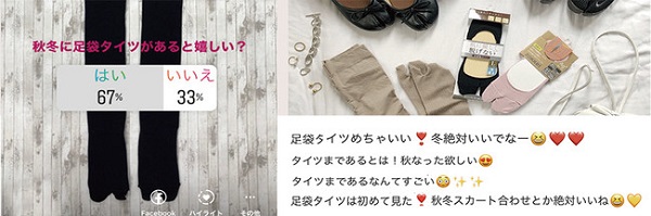 次なるヒット商品を模索する中、社内で「秋冬にパンプス用の足袋ソックスでは寒いのではないか?」という意見があり、Instagramのアンバサダーにもインタビューをしたところ、「秋冬に履ける足袋タイツがあると嬉しい」という多くの意見が寄せられたという。