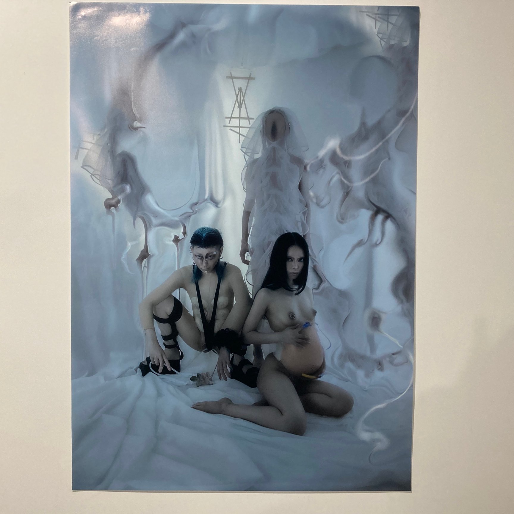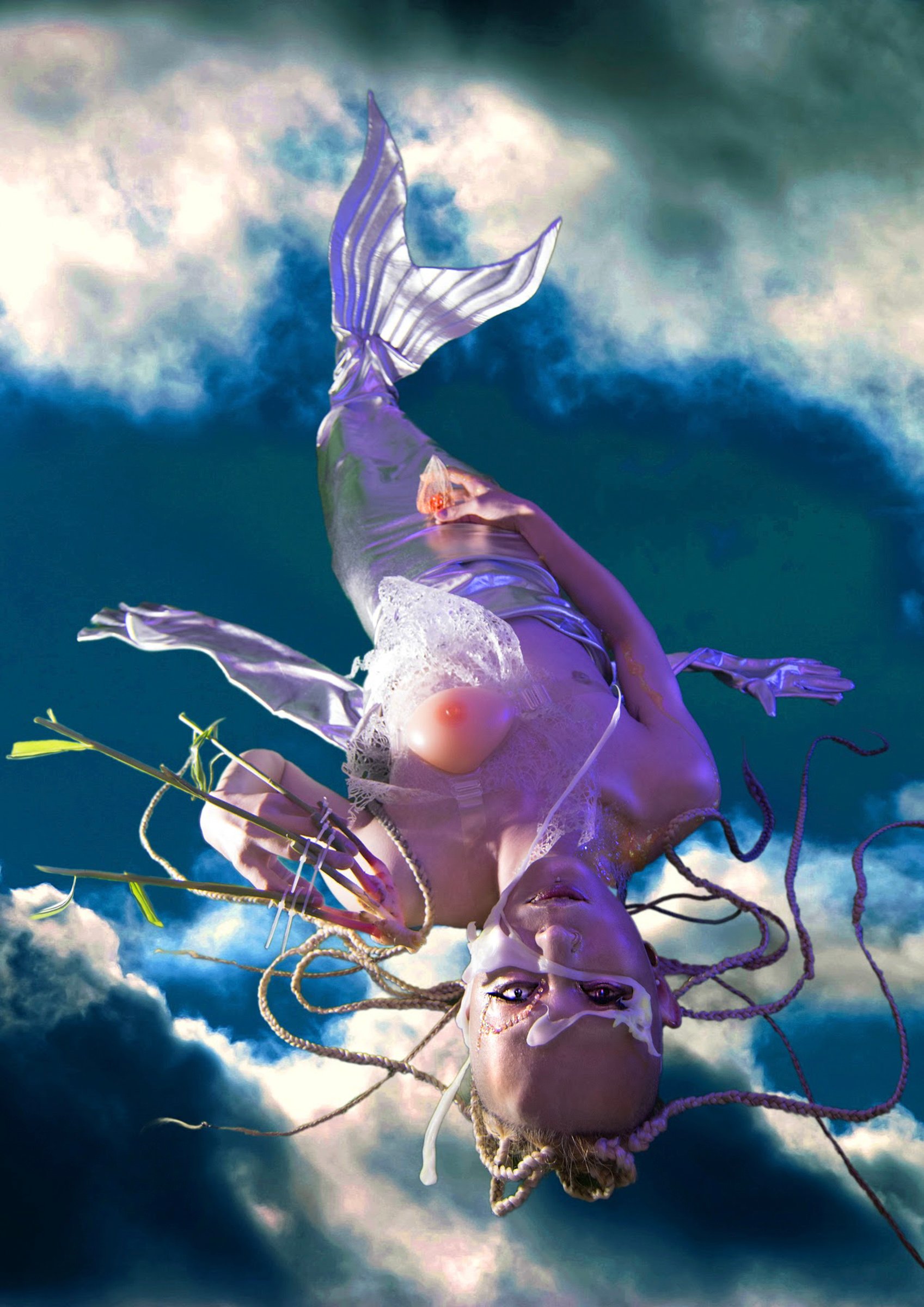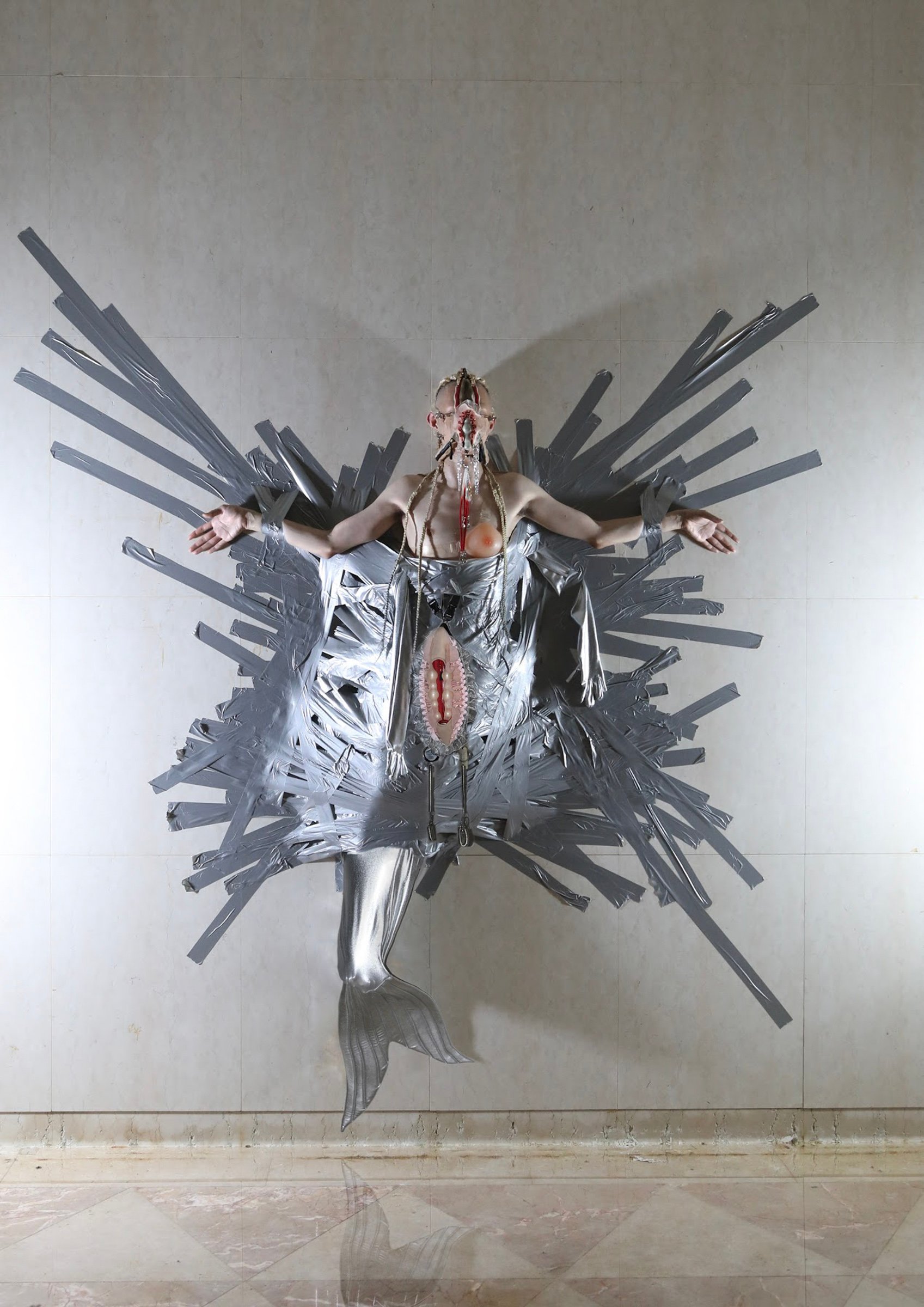 個展「ANIMAGRA」は、エネマグラとラテン語で、「生命」や「魂」を意味するアニマを掛けた造語。2020年10月にオープンしたばかりの会場では、セクシャルマイノリティであったと言われているハンス?クリスティアン?アンデルセン(Hans?Christian?Andersen)の著作「人魚姫」にインスピレーションを受けたポートレートをはじめ、キリスト教系カルト教団の信者である両親を持つ川邊の原体験に基づく作品を展示。ジェンダーセクシャルマイノリティへの否定的な観念と共存をテーマとした新作ファッションプロダクトや写真、映像、インスタレーションなどが披露されている。