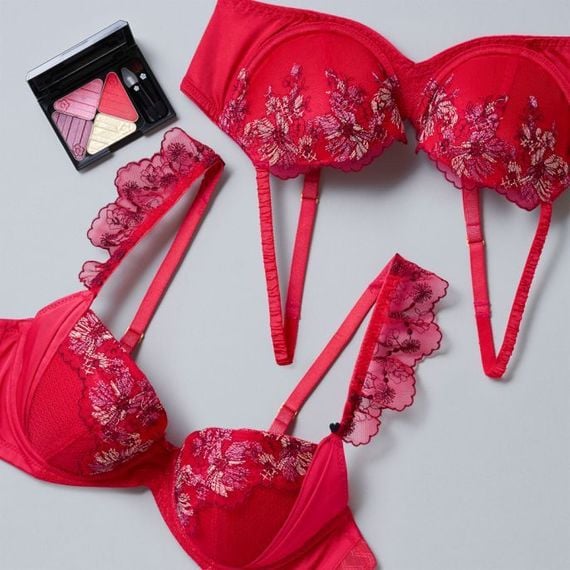 ホリデーパレットシリーズは、ビビッドなコスメカラーと光沢あるレースの「きゅっと寄せブラ」と「夢みるブラ」、ショーツ3型、ミニスリップ1型、シャイニーカラーシリーズは、くすみカラーの「夢みるブラ?ディープV」とショーツ2型。