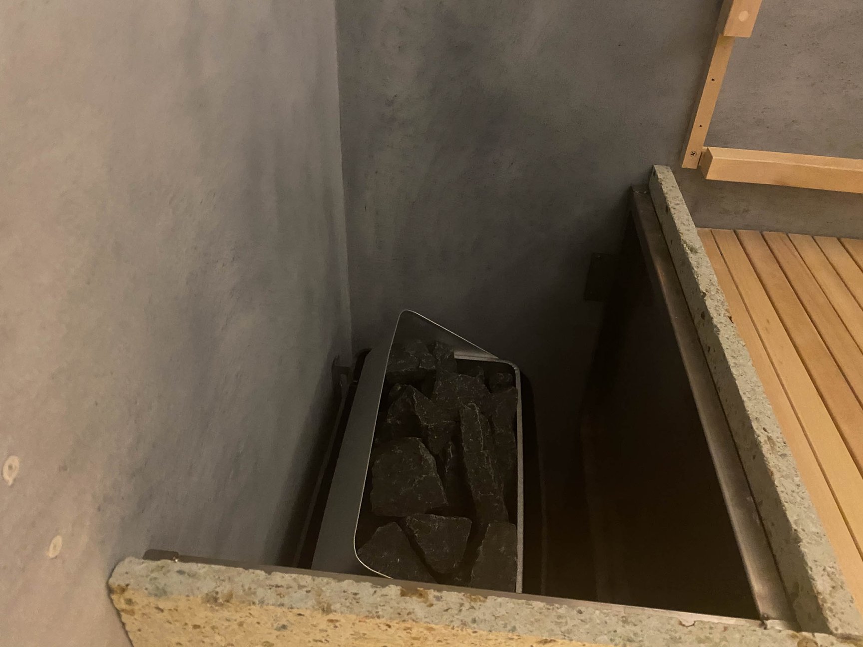 サウナ内には長さ2mのベンチと、本場フィンランドから輸入したサウナストーブを設置し、自分の好きなタイミングでストーンに白樺の香りがするアロマ水をかけ、ロウリュを体験することができる。壁や天井はダークグレーで統一し、間接照明のみのライティングで明るさを軽減。外界からの刺激を減らし、瞑想がしやすい空間に仕上げたという。クールダウン用の水風呂は設けておらず、代わりに水温15度前後の大粒の冷水が流れる400口径のオーバーヘッドシャワーを用意。また、ミスト水流に対応した手持ちのシャワーヘッドも備えている。このほか、ブルートゥース(Bluetooth?)スピーカーを完備し、室内では自分の好きな音楽を流すことができる。髪を乾燥から守るサウナハットは無料で貸し出す。