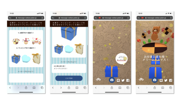 主にtoBのサービスだが、一般ユーザーも体験できるようになっていたので実際に試してみた。体験用で用意されていたのは、お菓子(プレゼントイメージ)とラッピングが3種類ずつ。手順通りメッセージカードを作成して開いてみると、ラッピングからテキストとお菓子が飛び出し、飛び出す仕掛けのメッセージカードをもらったときのようなワクワクを感じられた。