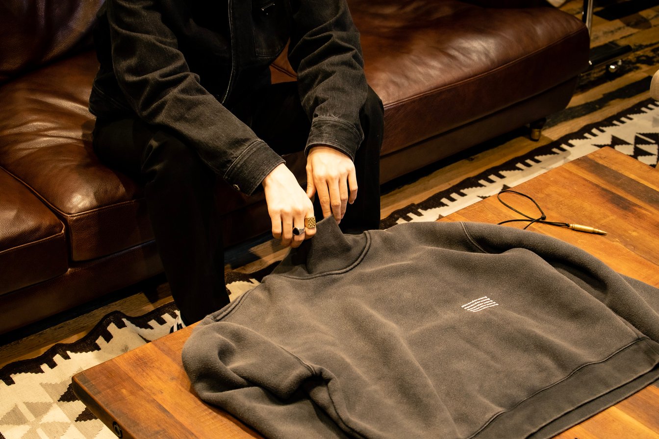 川谷:さっきのマルジェラのニットより更に暖かいですね。仕事の特性上、外に出る機会が少ないのでアウターはあまり着ないんですよ。「アウターは着たくないけど寒い」という場面でニットは良いんですが、ギターに引っかかってほつれてしまうことがあってストレスだったんです。かといってただのスウェットだと寒いな、と悩んでいた頃に見つけたので重宝していますね。逆にこの上からアウター着ると暑いくらいなんで。