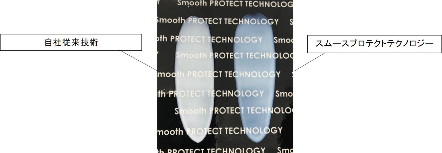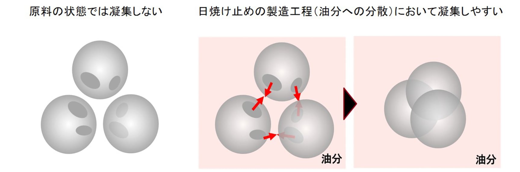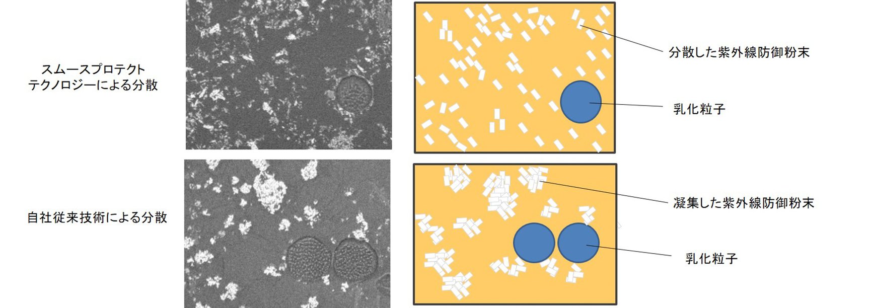 一般的な日焼け止めの製造工程においては、粉末を油分に分散すると凝集が起こりやすいため、日焼け止めに強い凝集力を持つ粉末を安定的に配合する技術が求められていた。今回の技術確立によって紫外線防御粉末に自社開発の分散成分を効果的に配合し、高圧での特殊な処理を行うことで安定的な分散状態を実現。自社の従来技術で分散したものと比較を行った結果、従来技術の約2.9倍の紫外線防御効果を引き出すことが確認できたほか、同じ塗布量では明らかに白さが軽減されることがわかった。また、電子顕微鏡写真を比較するとより微細に分散されており、使用感触の違いでは肌への負担感や被膜感が減少し、より素肌に近い使用感触が得られるという。