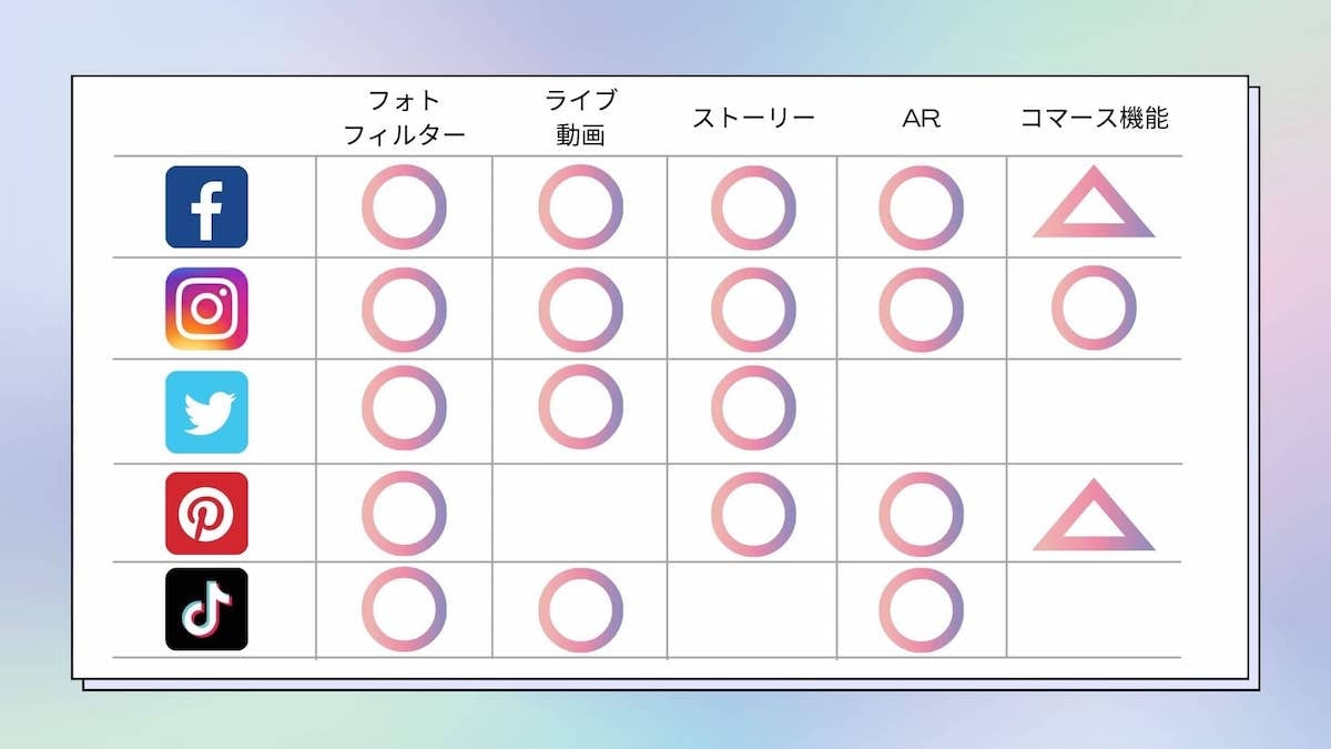 上記の図は、主要ソーシャルメディアの主な機能の有無を比較した表である。基本的に全てのソーシャルメディアで、写真や動画コンテンツの投稿、共有がされるため、加工機能や、3D?360度画像といったようなメディアのタイプも充実してきており、どこも他社に負けないようしのぎを削っている。