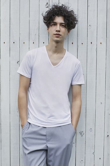 メンズ?レディスともTシャツやキャミソールなど従来からある商品に加え、新たな型を出す。メンズの新商品は「ワイドVネックT」(990円)。ネックと袖口をシームレス仕様にしたほか、ワイシャツなどの首元からインナーが見えにくいようにネックを深めにした。3月に発売予定。レディスの新商品は「レースUネックT」(写真、790円)。すっきりとした見た目にするとともに、汗染みが目立ちにくい。