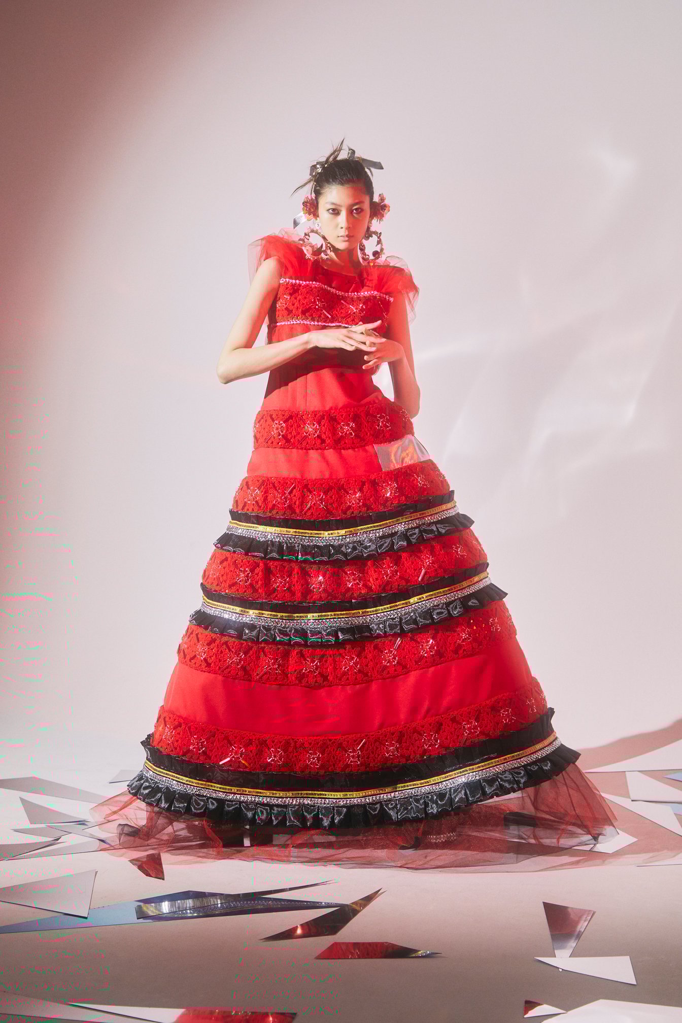 数型で構成されたデビューコレクション(2015-16年秋冬)は、方々のデザインコンペに出展したこともあって少しく草臥れて見えた。だが、毛皮、ニットともに、色柄の強い個性が描く陰翳と、流れるようなエキゾチックなモチーフが私の眼を射った。脳味噌に鳥肌が立った、と云うと、大袈裟に聞こえるが、それ程に彼女の服は私を虜にした。服は稚拙さの痕を大いに残していたが、そんな瑕(きず)などもろともしないロマンチシズムと云う強さが漲っていた。後述するが、「焔(ほむら)」をイメージした最新作然り、服は真っ直ぐで力強いのだ。どのように見られたいかと云う誇示やジェスチャーなどではなく、彼女の服作りは、自分が何者であるかを自身に示して見せると云う根本的な欲求としてのロマンチシズムに裏打ちされている。