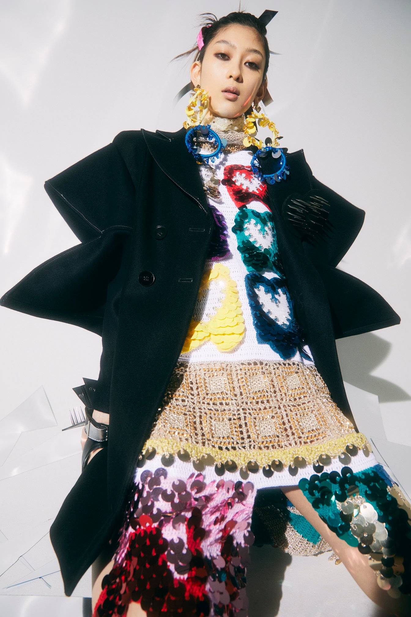 最近の小池の服は春夏と秋冬の区別を持たない。最新作も2021年コレクションと名付けている。既存のメカニズムに囚われず、過剰なパフォーマンスより離れ、本来の創作を損なうリスクのある時間的制約から自らを解放することの必要性を肌で感じているからだろう(勿論、ブランドの体力にも拠るのだろうが)。「私は、手仕事とパターンメーキングの面白さ、職人の高度な縫製、加工技術の凡てを掛け合わせたモノ作りを目指しています。この中でいちばん時間を要するのが手仕事です。手編みのニットやレースのデザインに加えて、編み図作成、モチーフの試作の繰り返しの過程より私の服はカタチを得ます。製図は勿論、一つ一つのビーズやスパングルに糸を通し、編み上げていきます。手仕事のニットが編み上がってから、時には同時進行で縫製へと入ります。刺繍やプリント図案もゼロから手掛けるオリジナルです。だから今の私には、半年の周期では短いのです。理想とする服作りを日々見付けながら少しずつ前進しています」と彼女は云う。