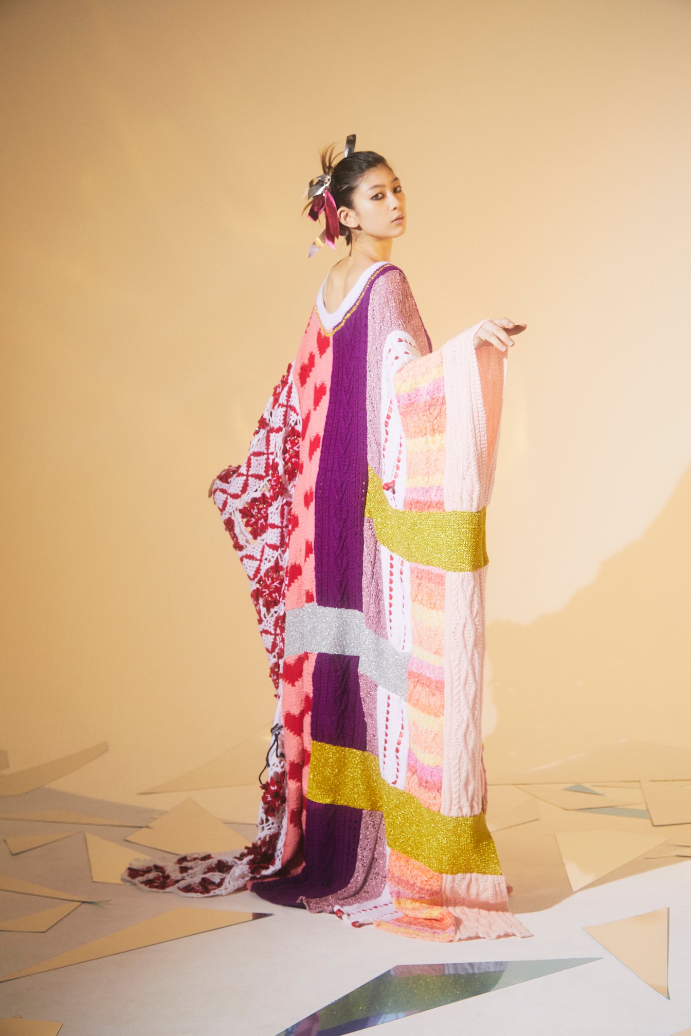 服は勿論、絵でも小説でも音楽でも、流行りと云うものがあって、その時の群集心理で流行りに合ったものはよく見える。新しいものが出来ると云う点では認めるにしても、そのものの価値とは違う。やっぱり自分を出すより手はないのだ。何故なら、自分は生まれ変われない限り自分の中に居るのだから。流行り廃りに異を唱える小池のモノ作りは「和」の伝統や工藝に影響を受けている。デビューコレクションは、京都の老舗、龍村(たつむら)美術織物の創業者、初代龍村平蔵の作品集に鼓舞されたものだった。「和」を紐解いているからとて、安直なジャポニスムを声高に謳歌するブランドではない。モチーフや技法を洋服に翻案する試行錯誤の過程(職人たちとの対話)こそ彼女の創作の内燃機関である。今回は、日本の第一礼装である「振袖」の文化に強く惹かれたと云う。「振袖の柄の中には幾多の色彩が混じり合い独特の調和があります。そこに帯の輝きが加わることで一層華やかさが増します。今回は色彩と輝きを大切にしたいと考えました」と小池は云う。帯の造形にも影響を受けたようで、「帯のような襞飾りやカット、結びを私流にデザインしています。帯枕の代用品を作り、帯に立体感を出し、ファッションとして取り入れるようにしています。肩から少し帯風の布が見えるルックは、日本の伝統文化に根差しています」と云う。刺繍には飛翔する鶴を題材にした。