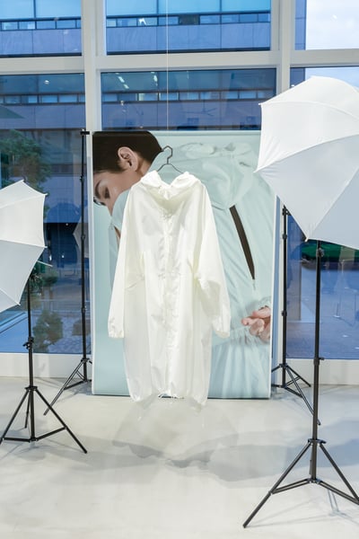 第2弾では春先や初夏に向けて、風合いを楽しめる軽やかな着心地のアイテムを提案。通気性に優れた機能素材を使用したシャツ3型、ボトムス2型を用意する。トップスは、洗い加工によりユーズド感を出した「ラウンドカット ロングシャツ」(2万7500円)をはじめ、前開きを作らずミニマルに仕上げた前身頃と、 編み上げた後身頃の二面性が特徴的な「バック レースアップ シャツ」(3万1900円)、リラックス感のあるサイジングに仕上げた「オープンカラー シャツ」(1万8700円)をラインナップ。ボトムスは、バック レースアップ シャツとセットアップで着用可能な「センタータック ショートスラックス」(2万7500円)と、ディーベックの看板商品である傘から着想を得た「トライアングル サルエルパンツ」(3万5200円/いずれも税込)を揃える。