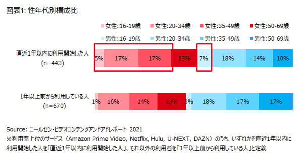 ニールセン社が動画サービスを「直近1年以内に利用し始めた人」と、「1年以上前から利用している人」を比較したところ、最近利用し始めた人は女性が52%を占める一方で、既存の利用者では女性の割合が46%と若干低くなっています。さらに年代別では、最近利用を始めた人全体では19歳以下の人が多くなっている一方で、女性に限っては20-49歳の人も多くなっていました。