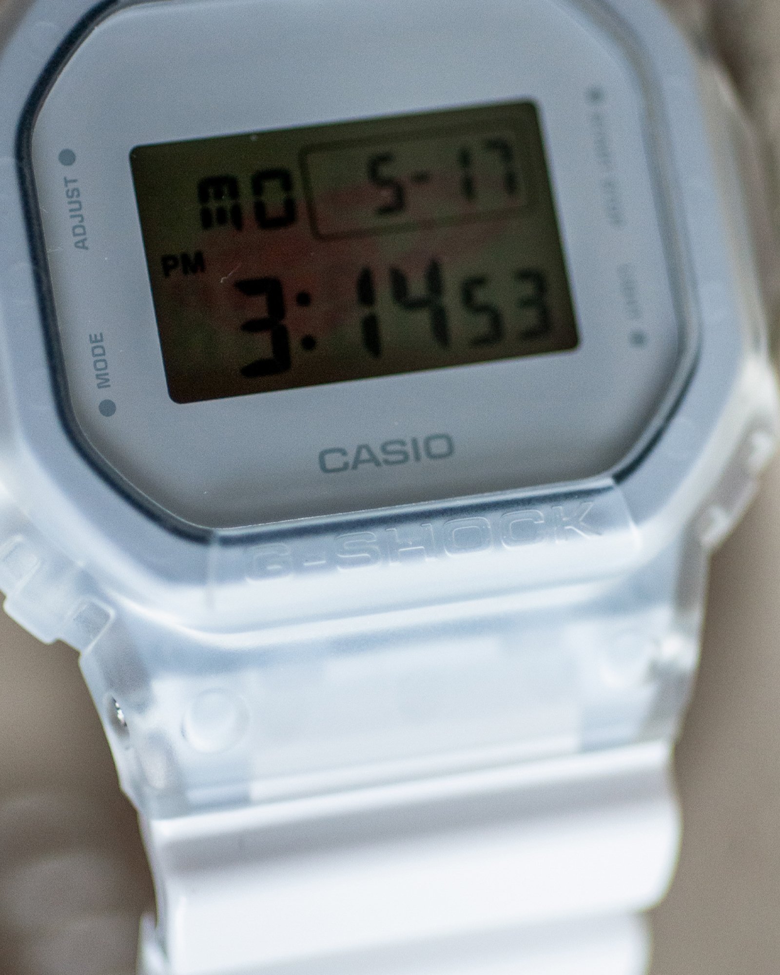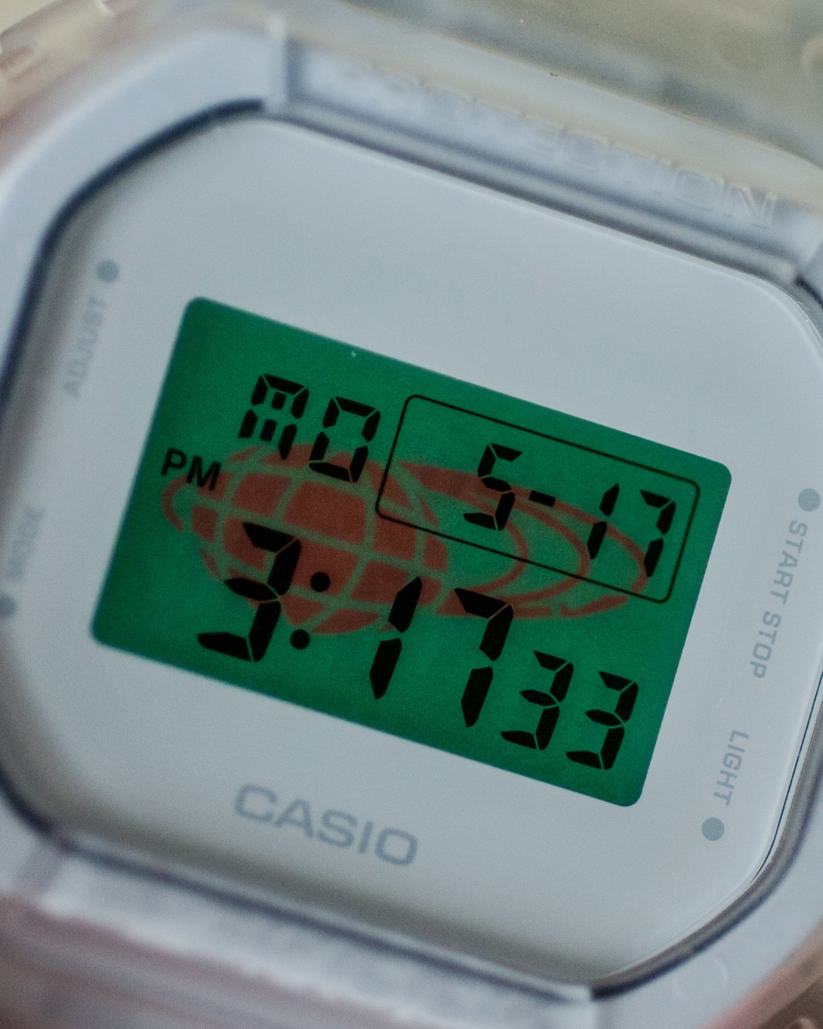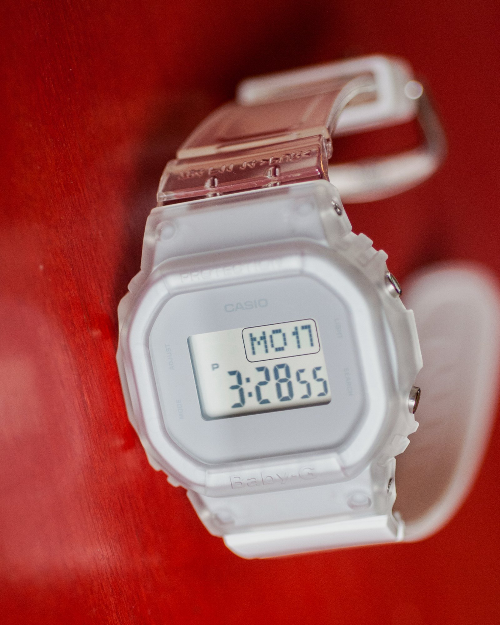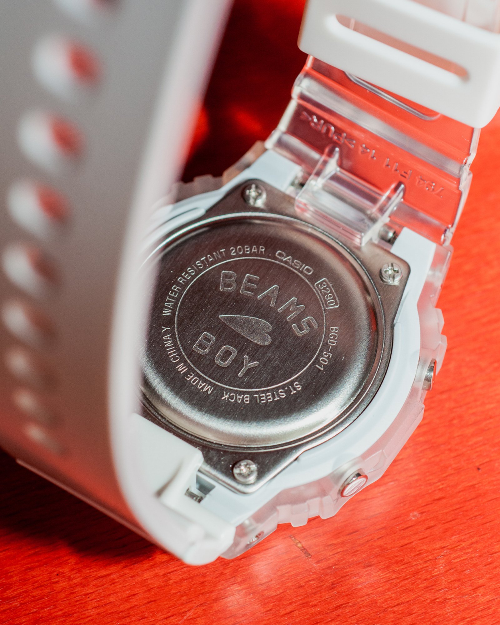 別注モデルは、メンズとウィメンズそれぞれのモデルを用意。メンズモデルは、Gショックの定番モデル「DW-5600」をベースに採用し、ケース、上下のベルト、遊環をクリア、マットクリア、ホワイト、艶ホワイトでそれぞれ配色した。バックライトと裏蓋にはビームスの地球儀ロゴをデザイン。グレーの文字盤はシンプルな構成に仕上げた。価格は税込1万7600円。
