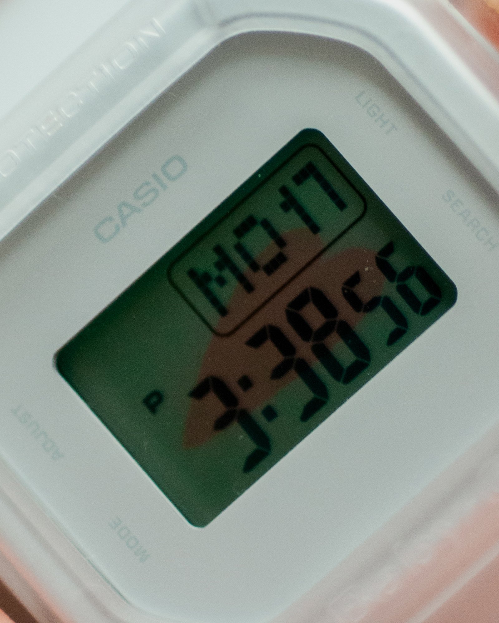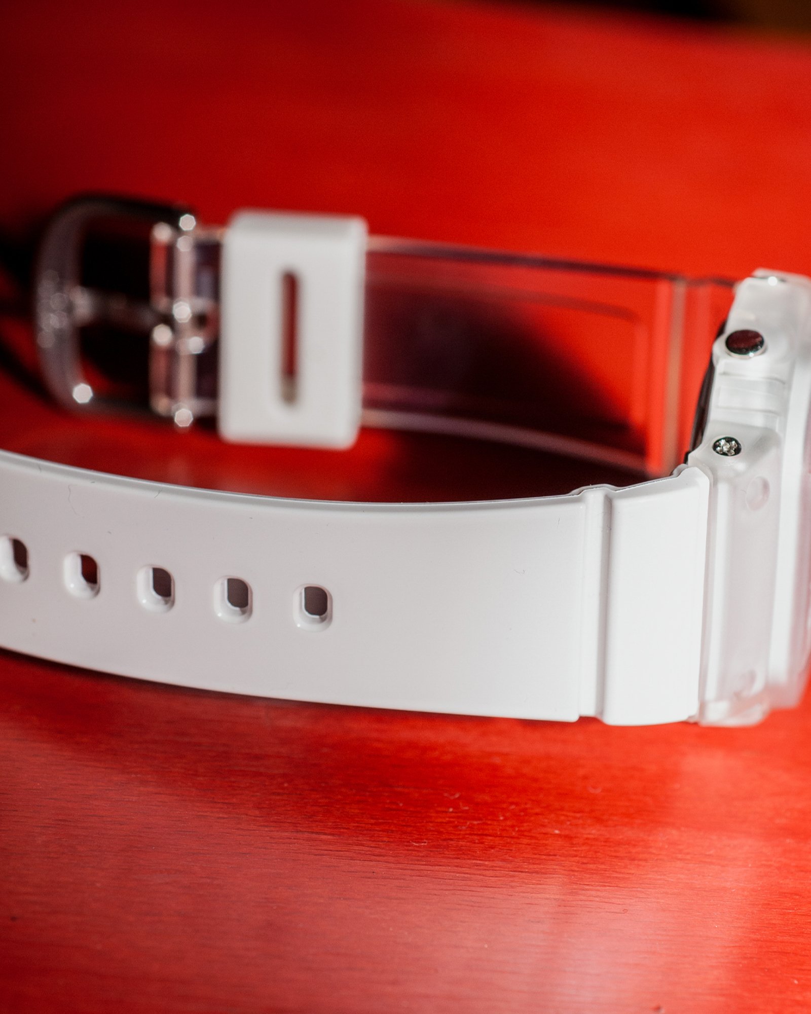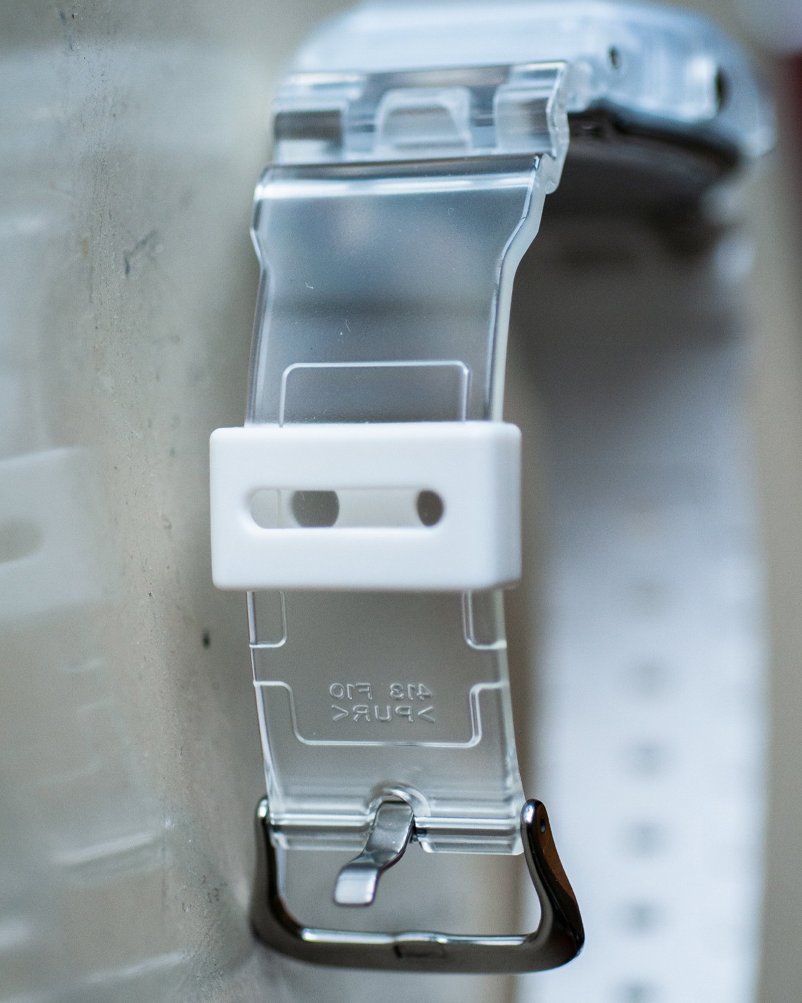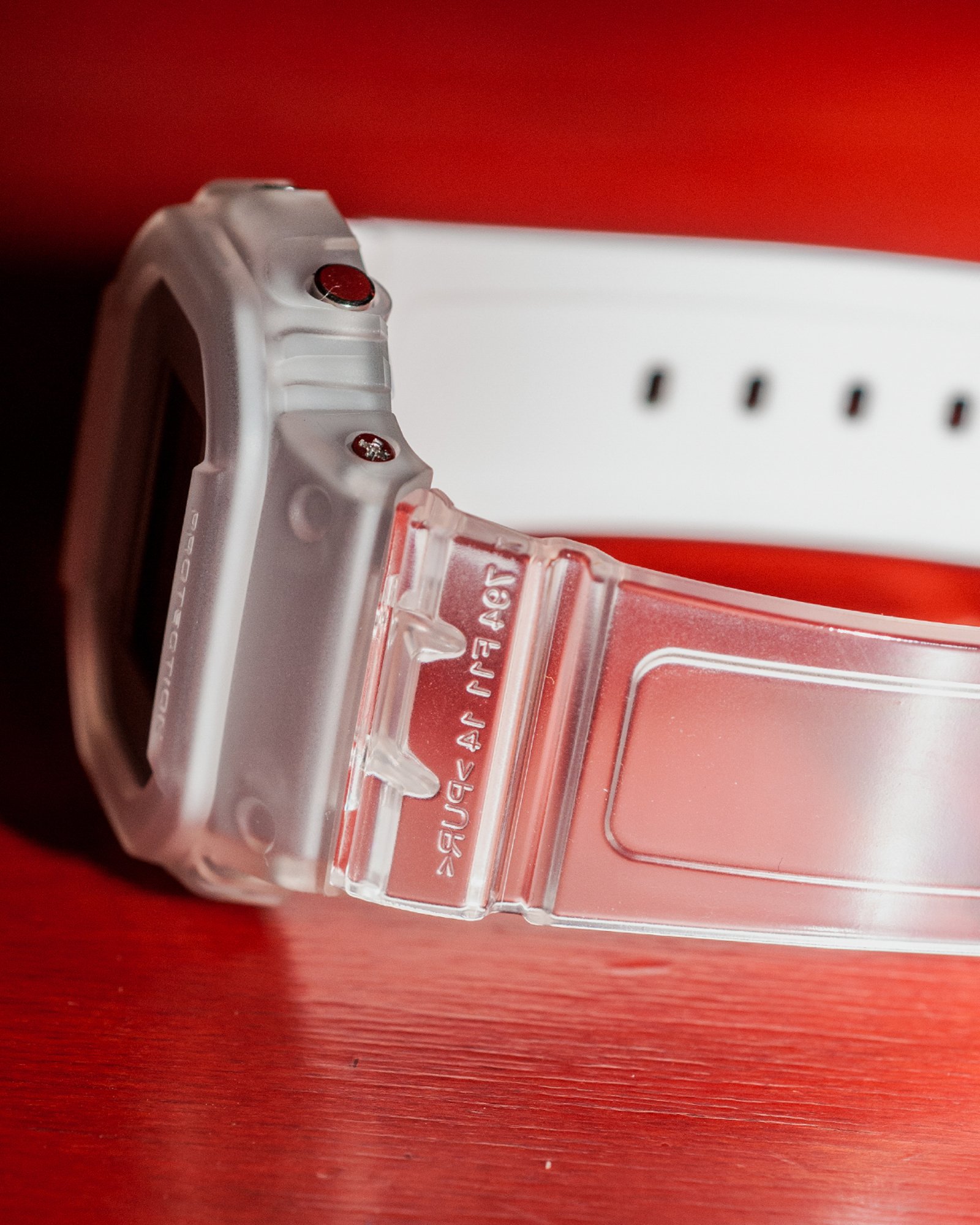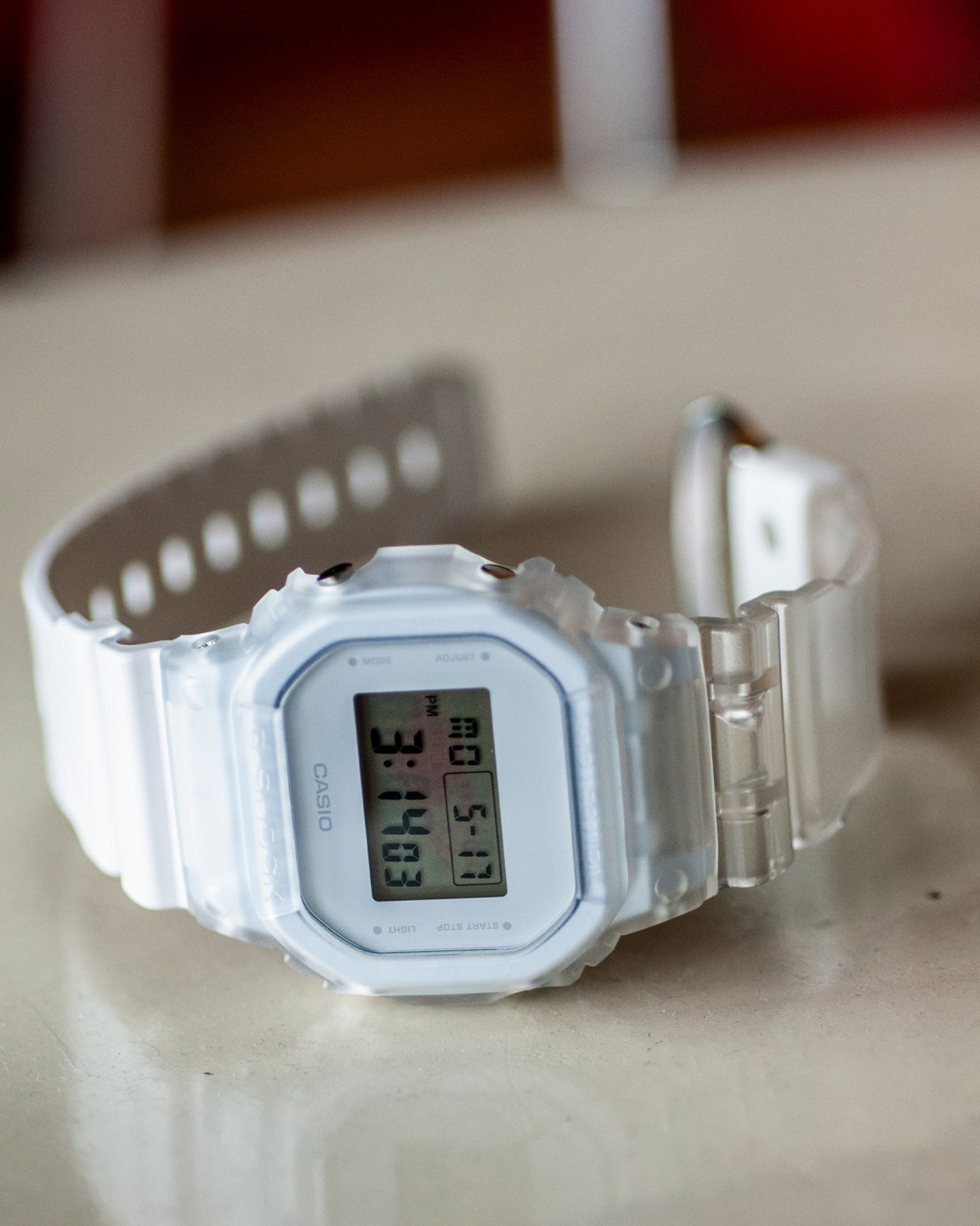 別注モデルは、メンズとウィメンズそれぞれのモデルを用意。メンズモデルは、Gショックの定番モデル「DW-5600」をベースに採用し、ケース、上下のベルト、遊環をクリア、マットクリア、ホワイト、艶ホワイトでそれぞれ配色した。バックライトと裏蓋にはビームスの地球儀ロゴをデザイン。グレーの文字盤はシンプルな構成に仕上げた。価格は税込1万7600円。