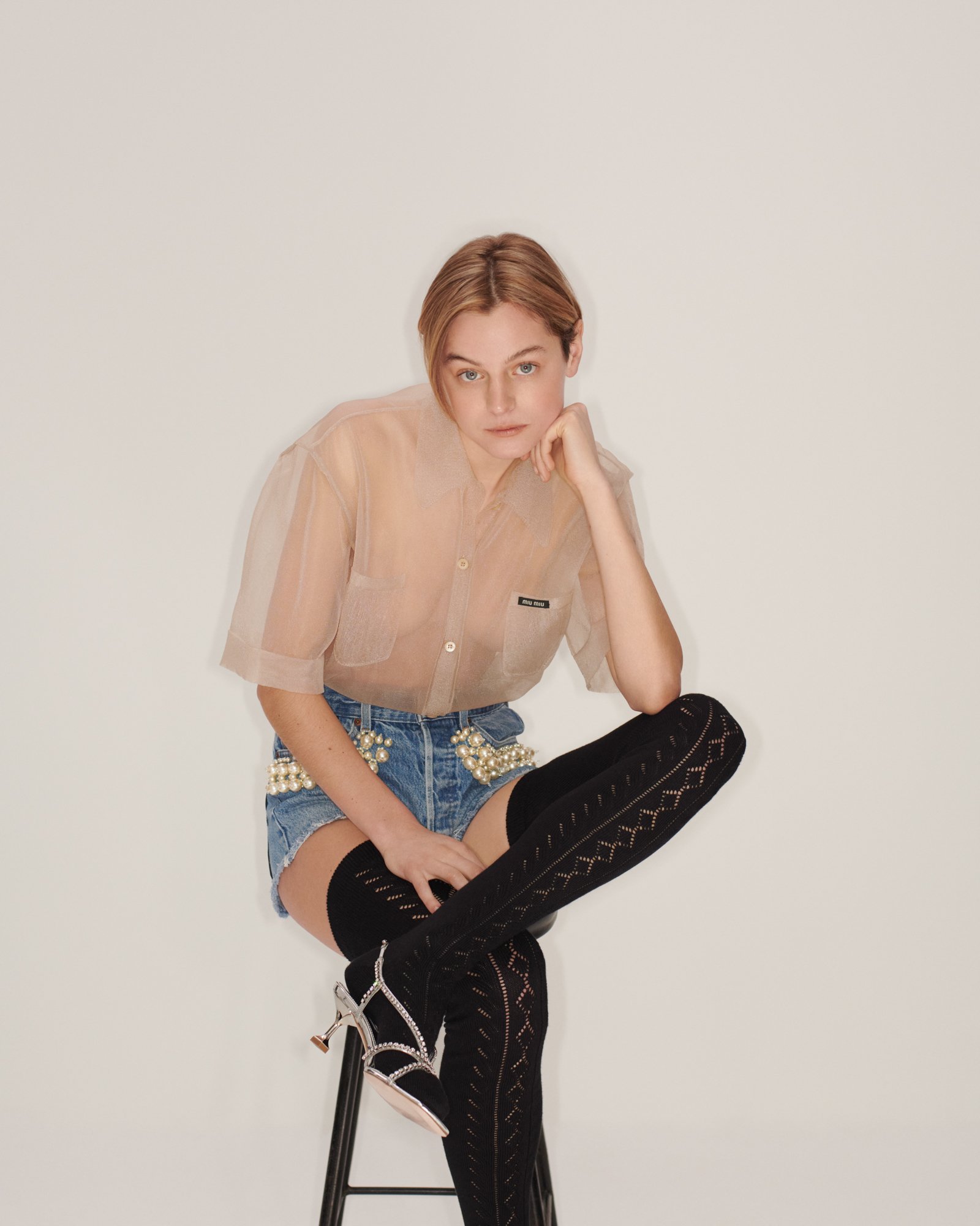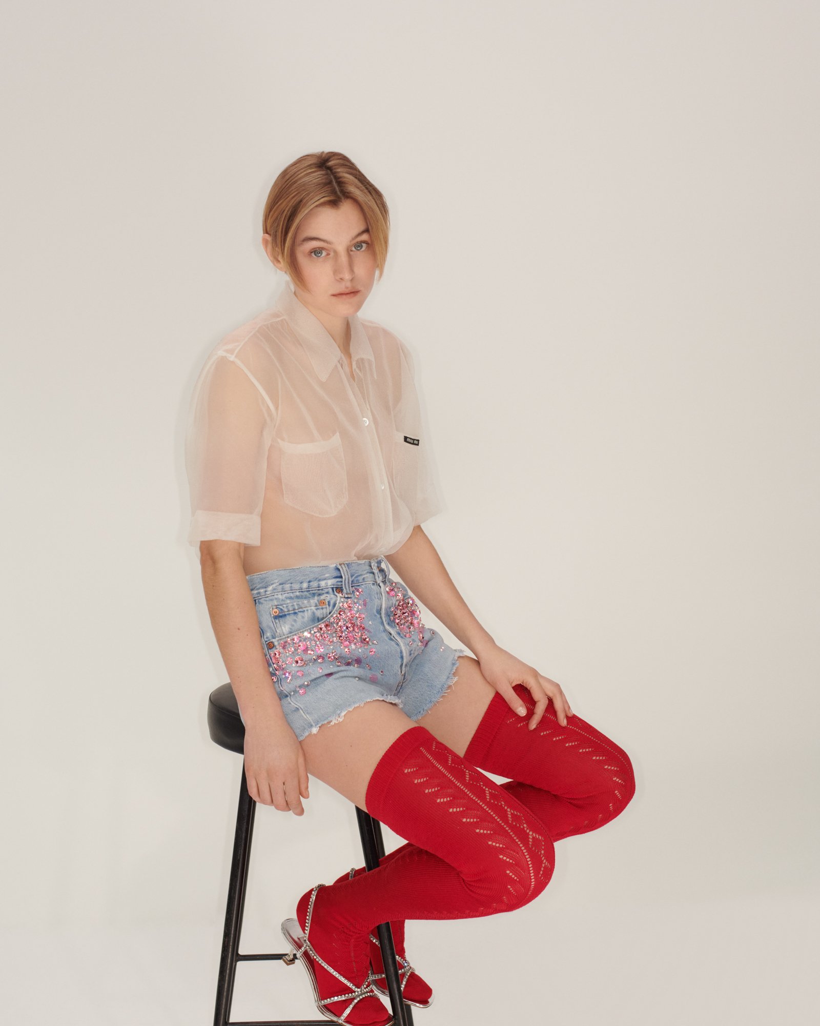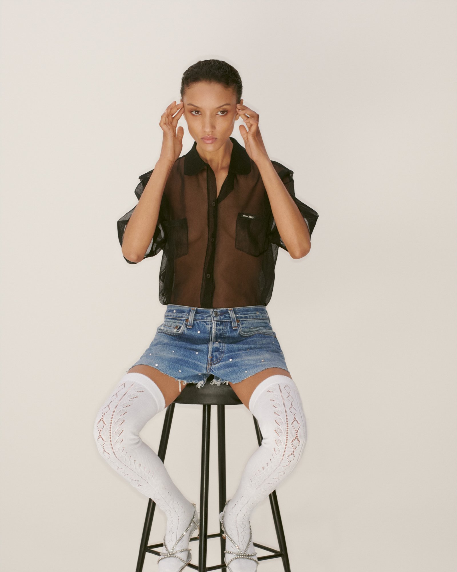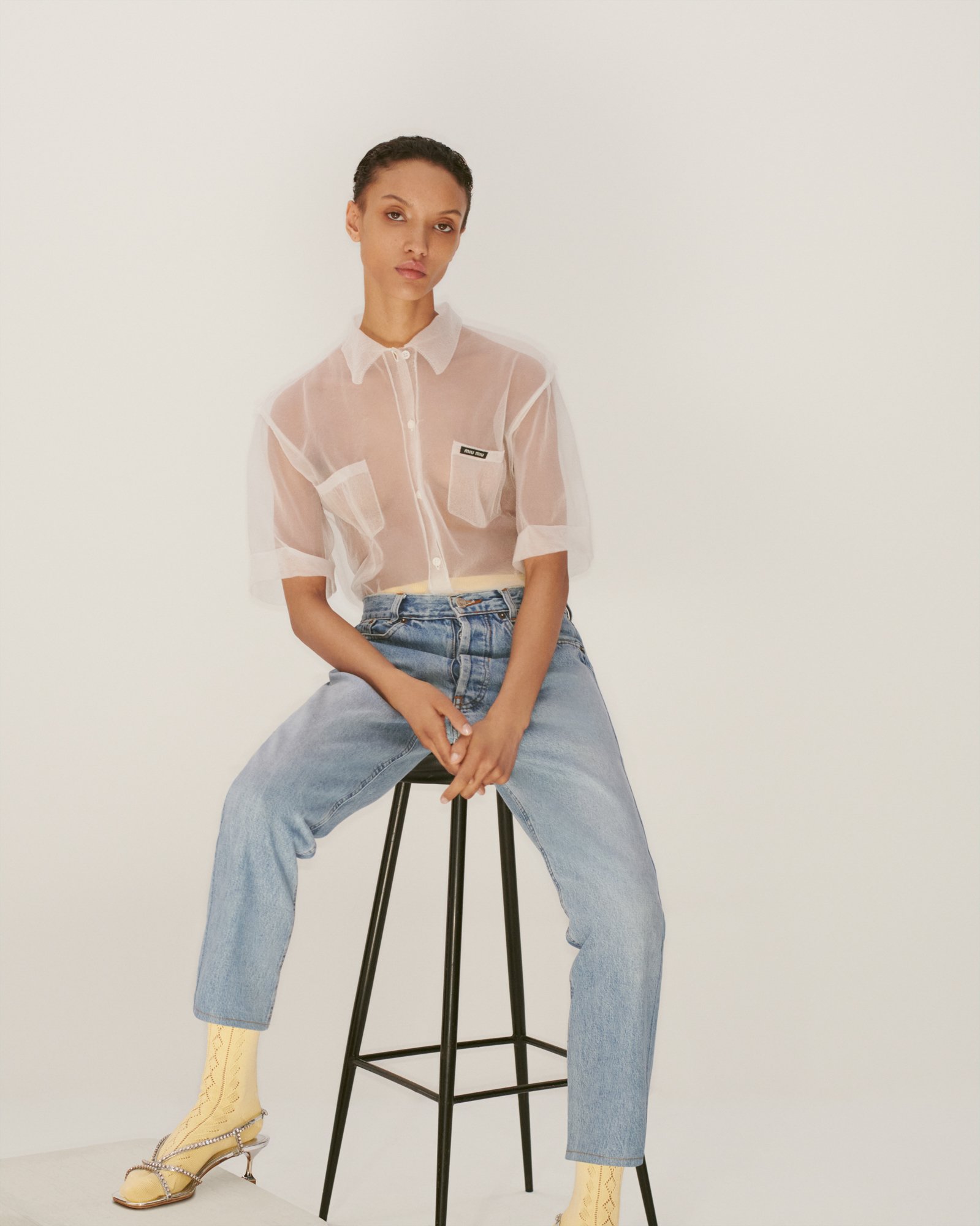 今回は、1980年代から1990年代にかけて生産されたメンズデニム「501」とオリシ?ナルのトラッカーシ?ャケットにフォーカス。1950年代半ば以降、若者の反骨精神の象徴とされてきたアイテムを、男性と同様に自由な精神を持つ女性に向けてアレンジした。501には、クリスタルやパール、フラワーモチーフ、ディアマンテ刺繍、パフスリーブ、ハ?フスリーフ?、アールテ?コ調のインターシャモチーフによるレザーパッチ、アイホ?リーカラーのタ?ッチェスシルクのロールアッフ?など様々な装飾でカスタマイズ。トラッカージャケットには同デザインに加え、白いレースの襟を組み合わせた。いずれのアイテムにもミュウミュウを象徴するピンクにアレンジしたリーバイスのパッチが付けられている。