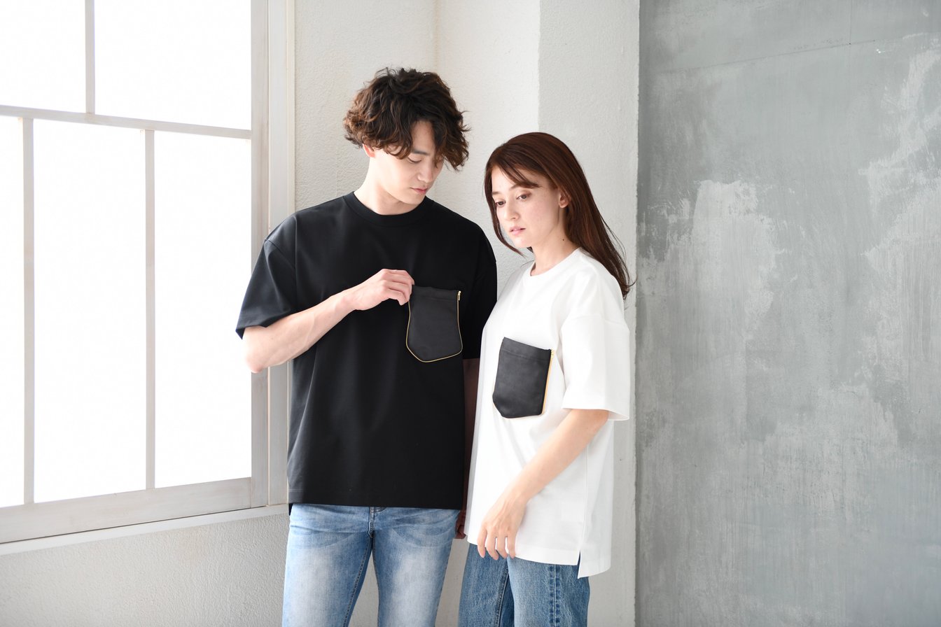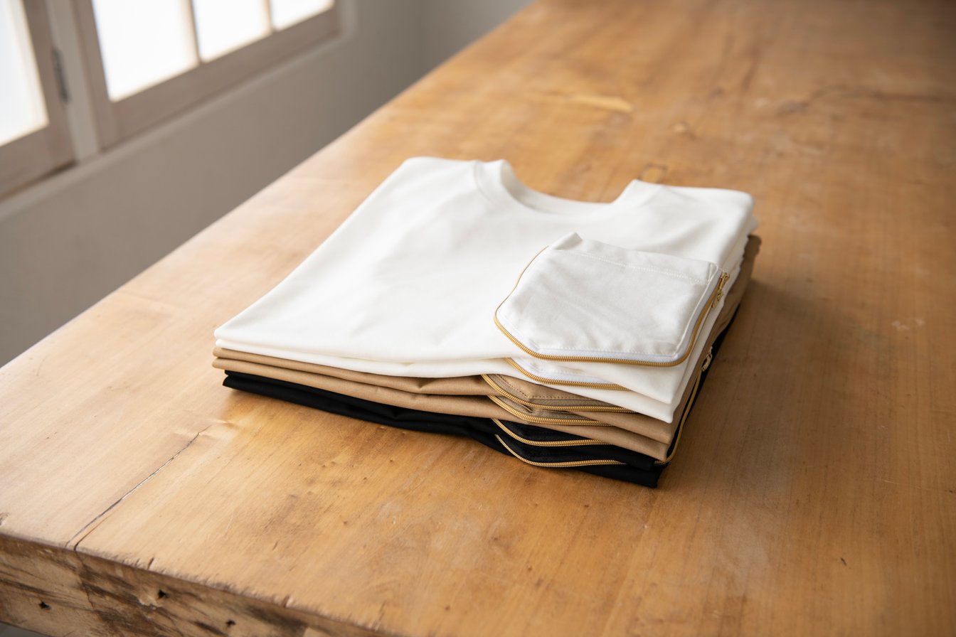「KUMIKI」は、Tシャツの胸ポケットをジッパーで外すだけで、ポケットが一瞬でエコバッグに早変わりするという、日本初のアイテム。