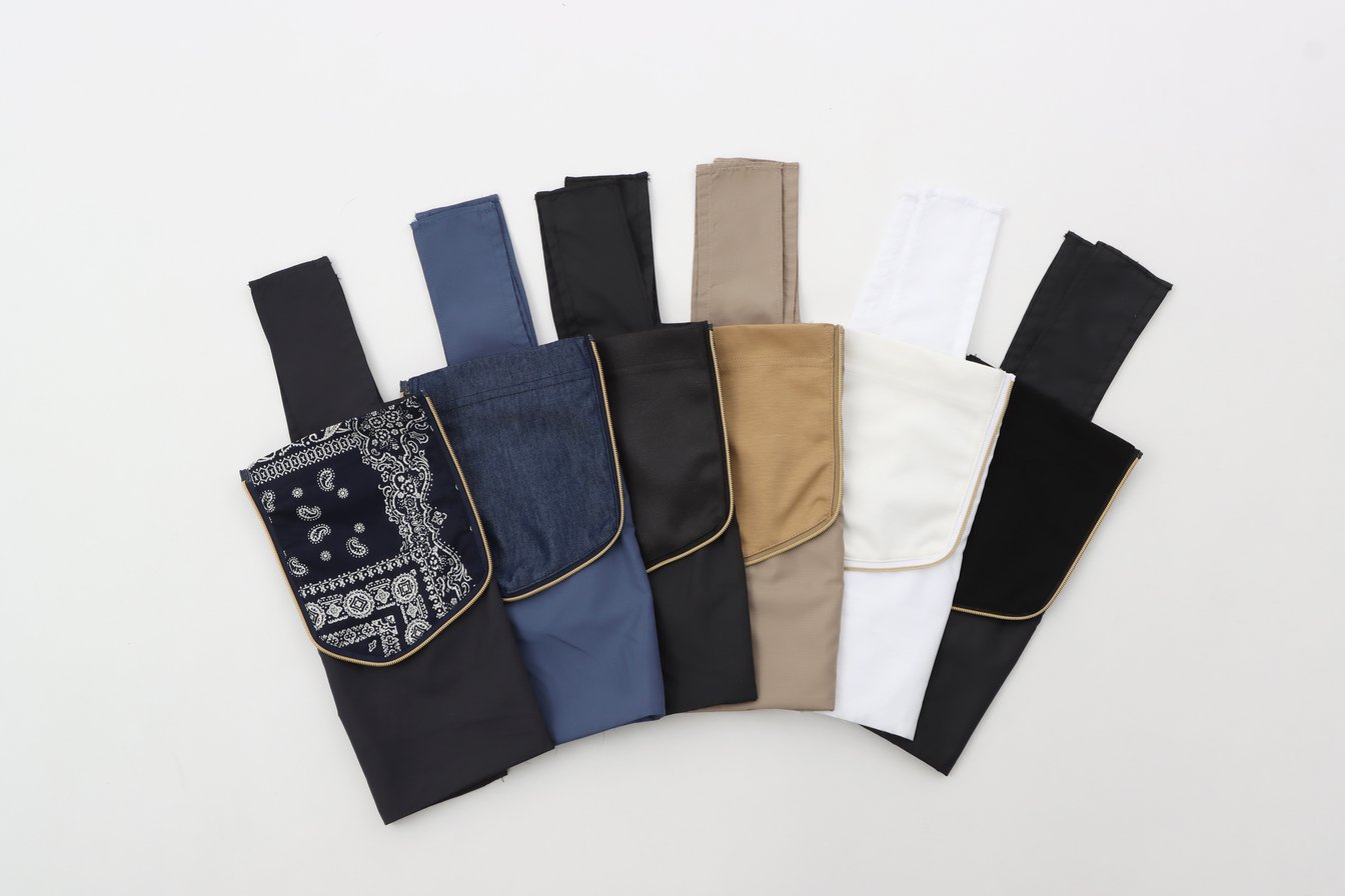ポケットの色柄は、エコバッグのついてないポケットも含めて全9種類。飽きずに長く着られることもサスティナブルにつながる。「エコバッグ付きポケット」は1,980円(税込)、「ポケットのみ(エコバッグなし)」は1,078円(税込)。