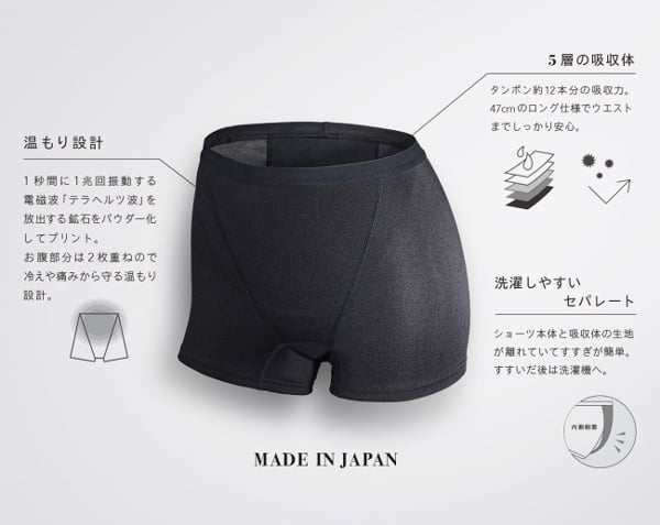 ブラックカラーで、ボクサー型のデザインは、ジェンダーを意識せず着用できるようにという想いから。「吸収帯を黒い繊維にすると、吸収率が悪くなってしまう」と言われていたにもかかわらず、高い吸収力を発揮しているといいます。