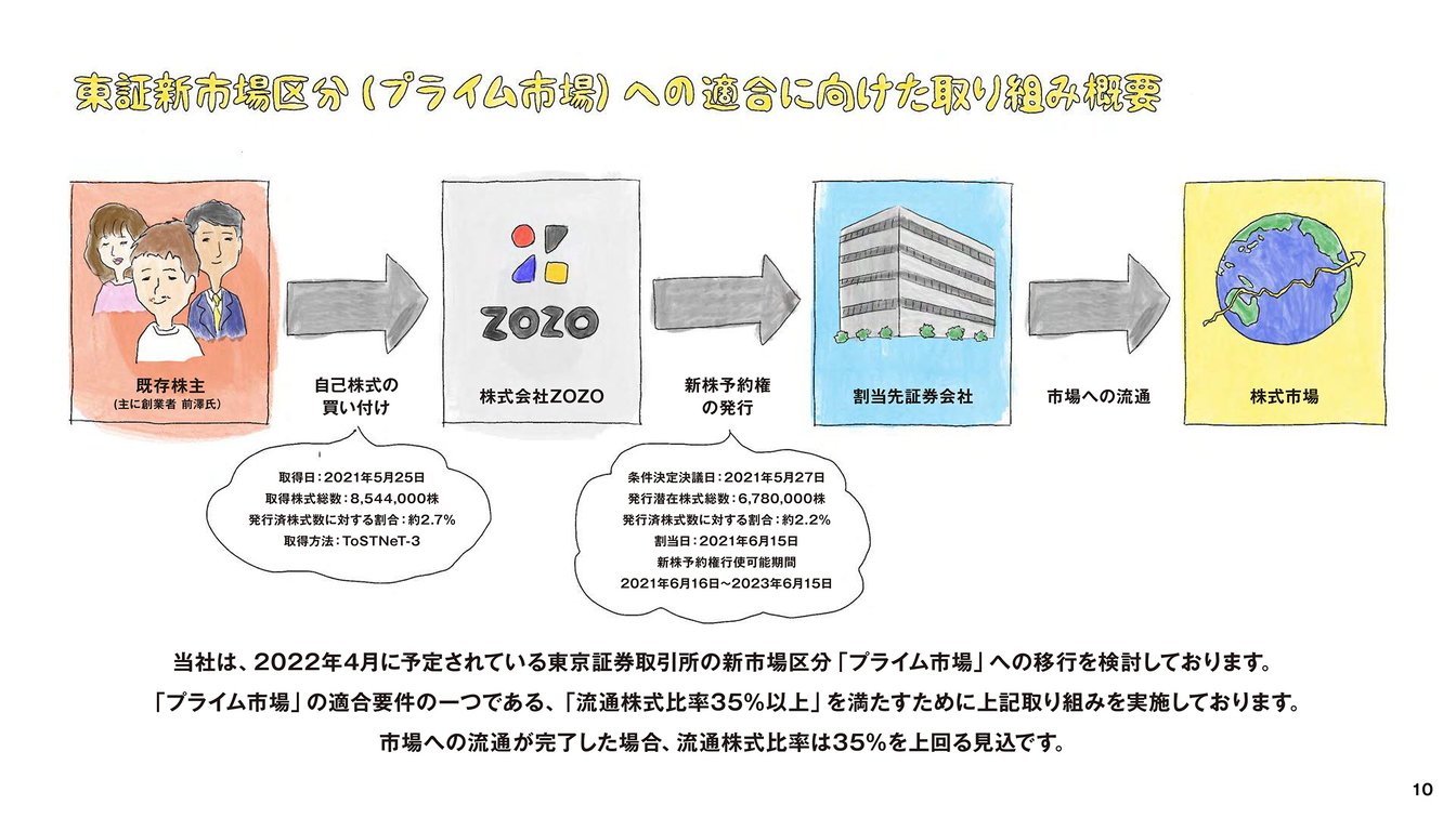なお、「東証新市場区分(プライム市場)への適合に向けた取り組み概要」のページでは「既存株主」の説明資料として創業者の前澤友作氏の似顔絵を挿入している。