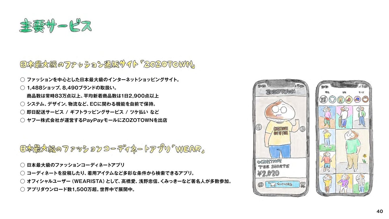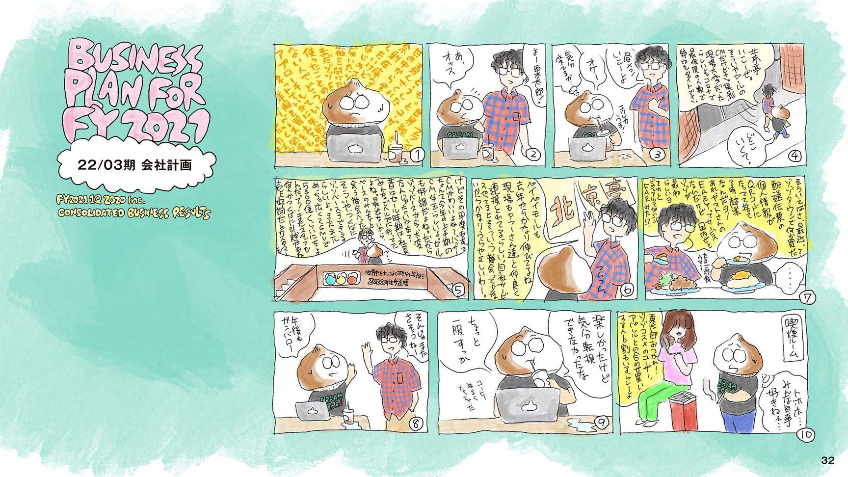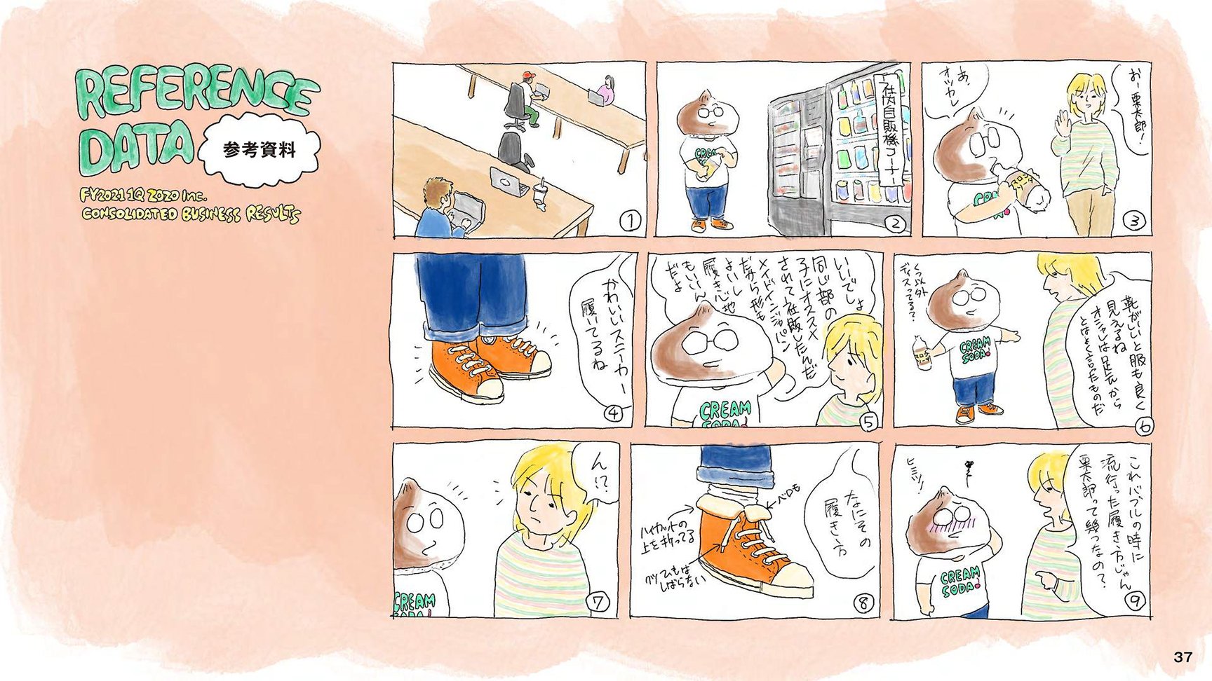 イラストや漫画を手掛けたのは、モジーという社歴15年の社員。モジーは決算資料の最終ページのあとがきで、「ZOZOの特徴の1つにスタッフにいい人が多いというのがあります。いい人が集まることで生まれる社内の雰囲気や人間関係の良さがZOZOの力の源泉と感じます。今回はこの愛すべき人たちや日常をマンガにしました。一部マンガゆえの誇張もありますが、基本的には私達の日常を元に描いています。少しでも親しみを感じ、応援してもらえれば幸いです」と思いを綴っている。最新の決算資料についてSNSでは「相変わらず面白い」「どこまでIRで遊べるのが攻めてほしい」と好意的な声が寄せられている。