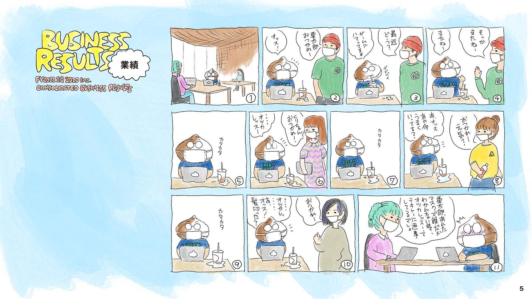 今回(2022年3月期第1四半期)は、架空のキャラクター「栗太郎」をとりまく新オフィスでの日常生活をゆるいタッチで描いたオリジナルの漫画を計4本掲載。澤田社長のヘアスタイルを彷彿とさせるシルエットや、澤田社長が栗太郎と同じデザインのTシャツを決算説明会で身につけていたことから、栗太郎のイメージモデルは澤田社長と考えられるが、同社広報はコメントを差し控えている。
