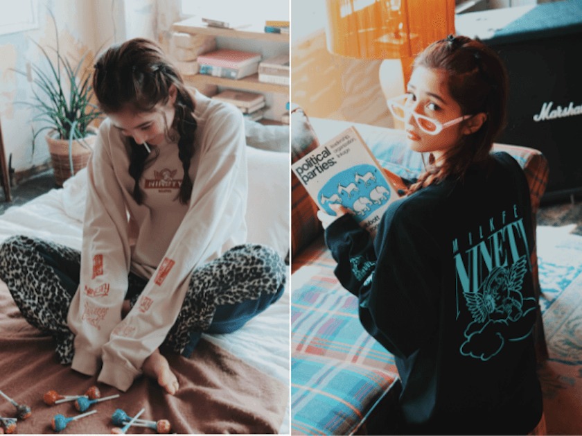 Tシャツは、「9090」定番デザイン「I’m not just a Pretty Girl (ただの可愛い女の子じゃない) 」を「ミルクフェド」らしく「I’m not just a Milky Girl」にアップデート。フロントの「9090 girl」ロゴは、ミルクを飲んでいるコラボ仕様に。バックプリントのグラフィックはミルクが垂れている様子をイメージしたデザイン。グラフィックカラーは、「ミルクフェド」の特徴的な赤と「9090」らしい配色で展開する。価格は5,480円。