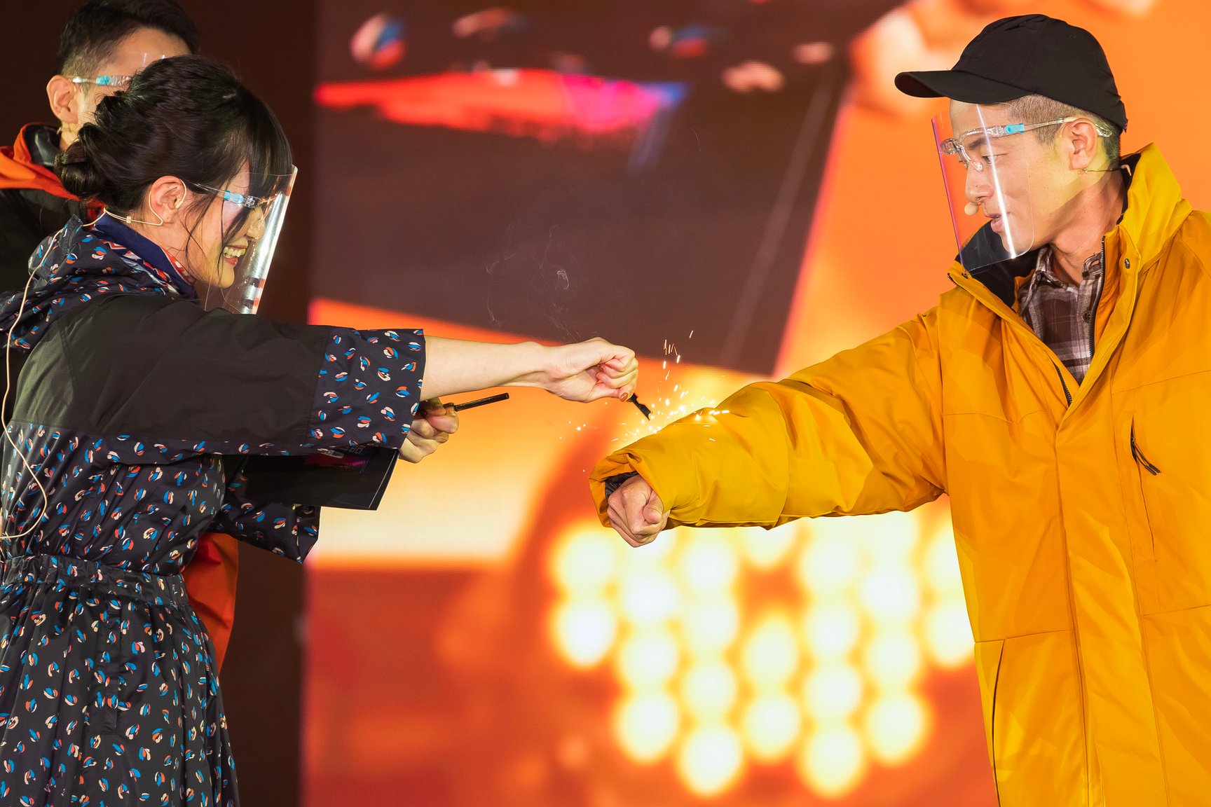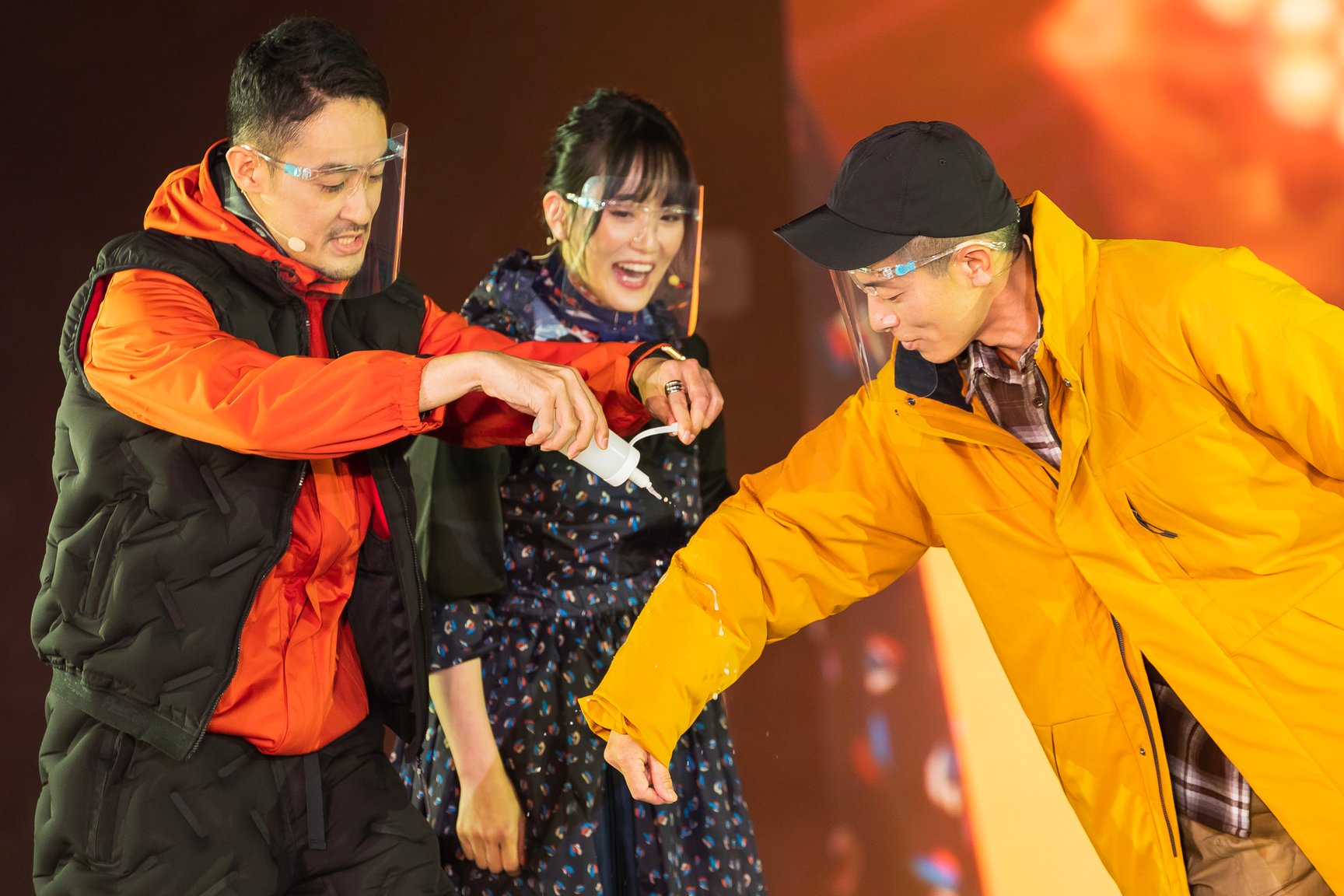 製品プレゼンでは、ライフスタイル系YouTuber かずひとファッションアナリストの山田耕史がモデルとして登場。付属のポンプで服の空気量を調節することで着心地を調整できる「エアロポンプウォームベスト」、防融加工を施した「FLAME-TECH 洗えるフュージョンダウン モンスターパーカー」のアイテムの魅力について紹介した。