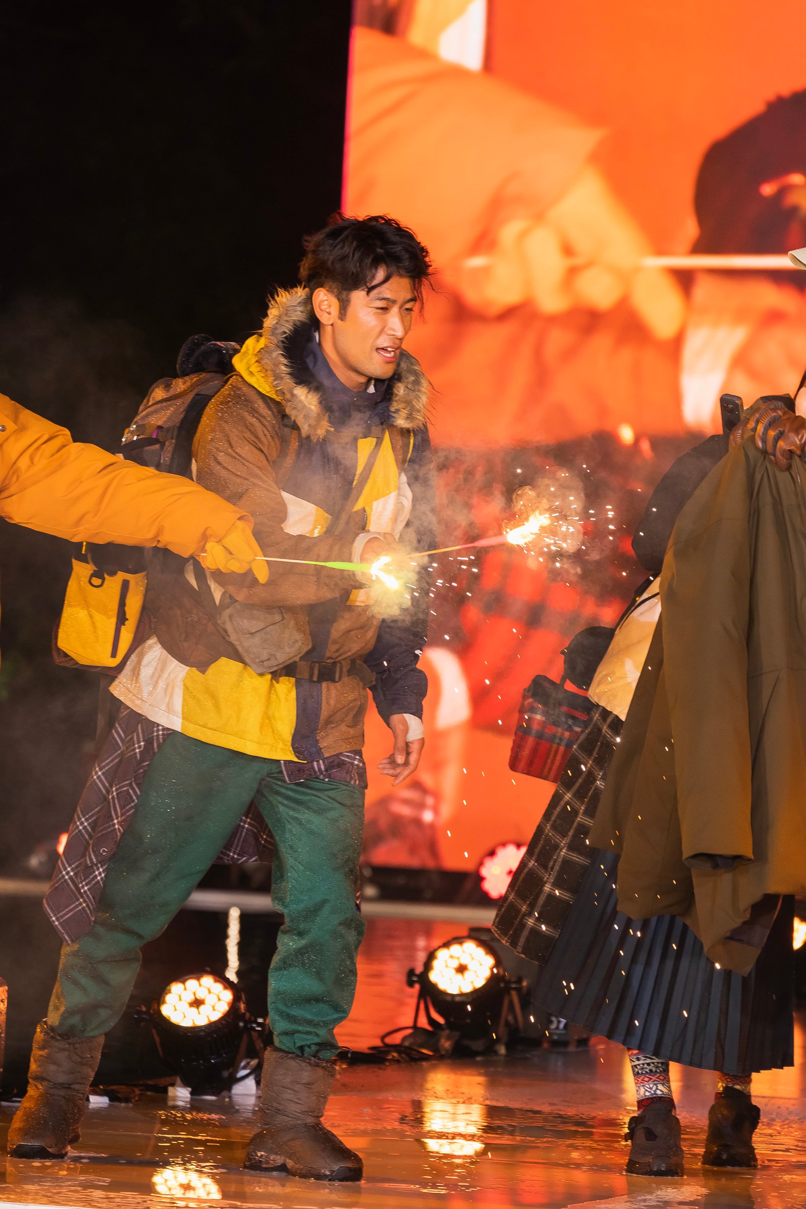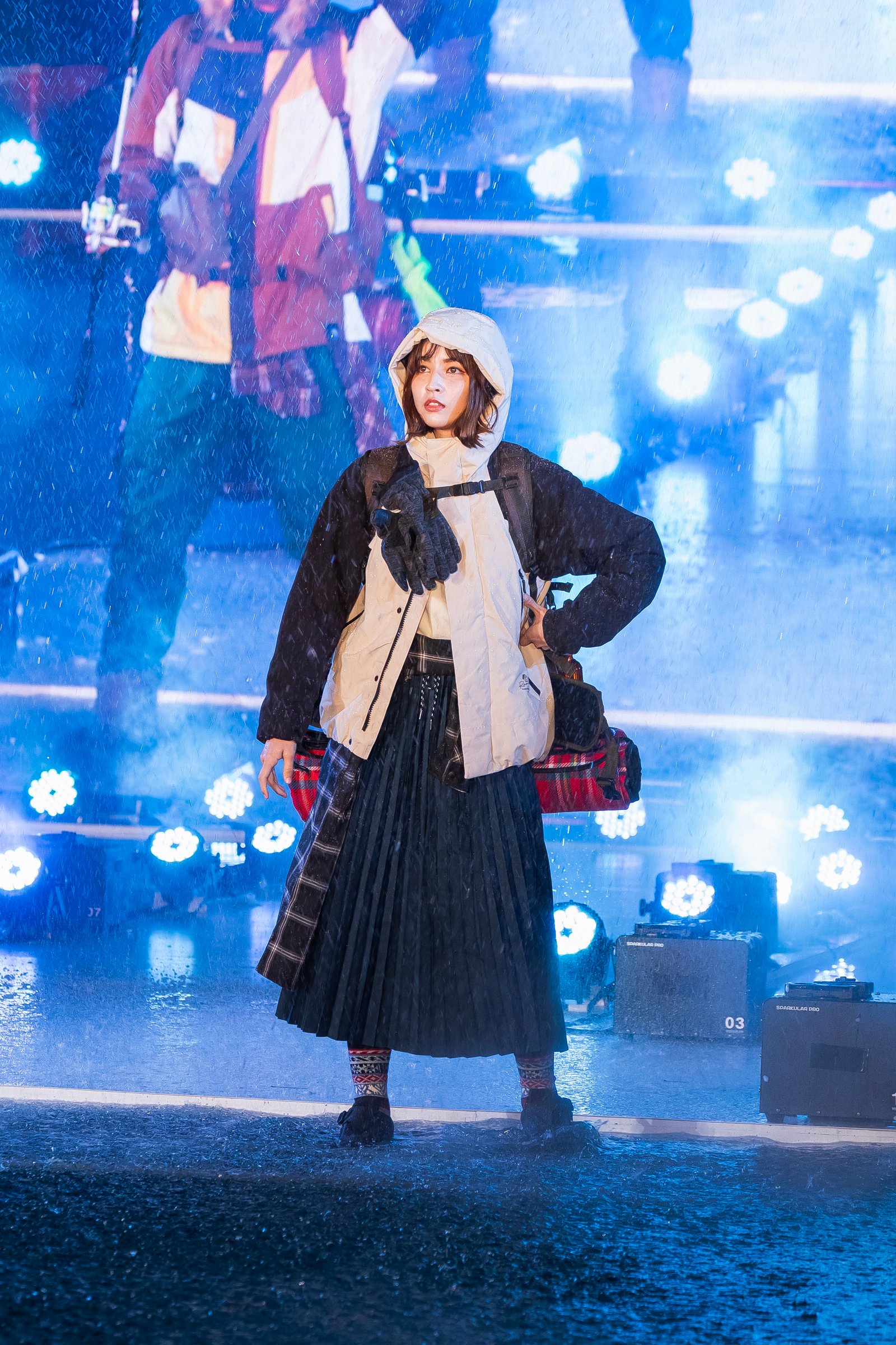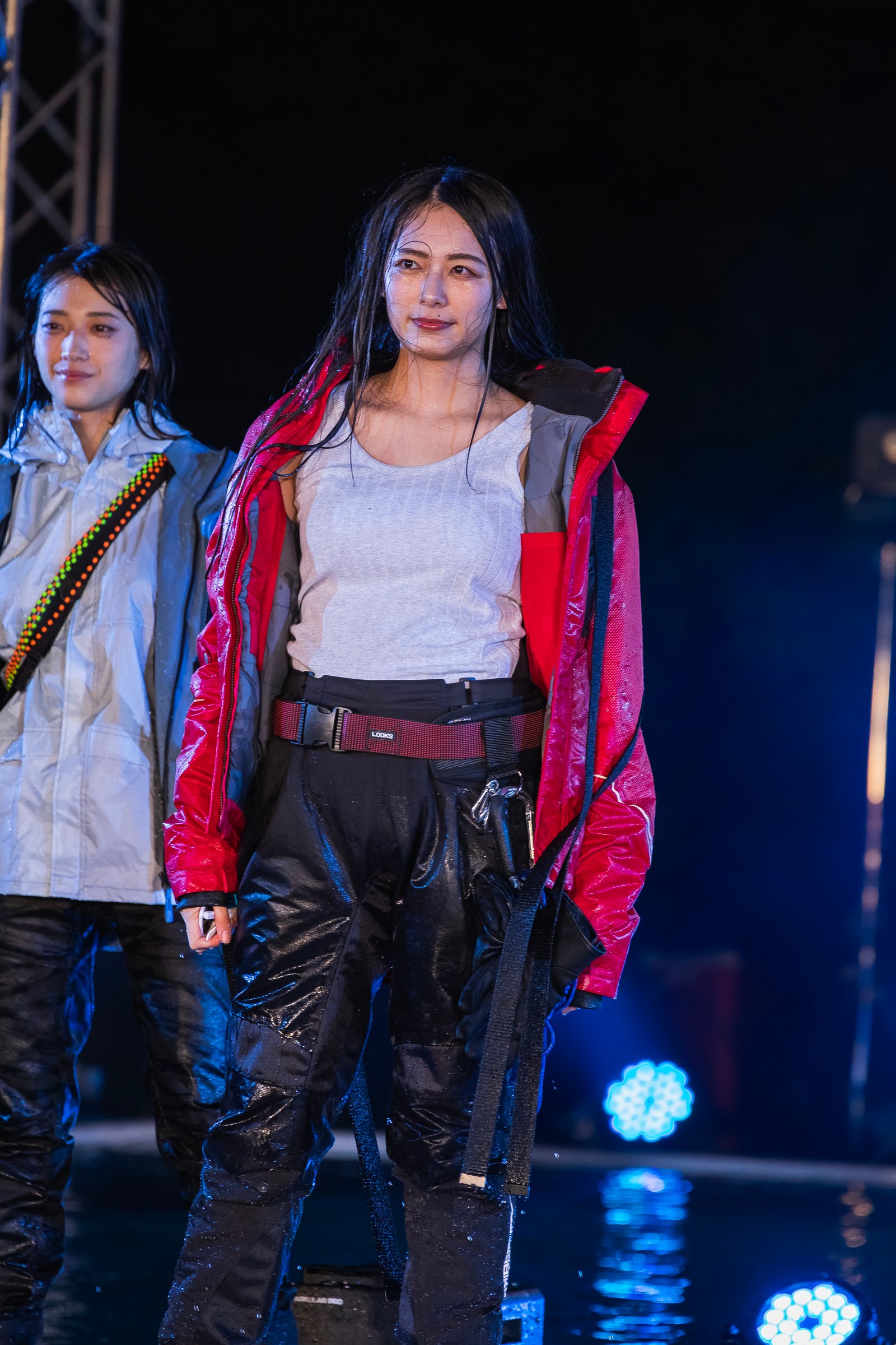 ランウェイ上で暴風雨、大風、大雪を再現した過酷ファッションショーでは、ライダーに特化した機能を搭載した「イージス360° リフレクト透湿防水防寒ジャケット」や「透湿防水防寒パンツBIKERS」「防寒ブーツ 氷雪耐滑ケベックNEO」を組み合わせた豪雨?豪風に耐えるコーディネート、着脱式のボアインナーを搭載した「イージス スノーウォームジャケット」や「イージースノースノーウォームパンツ」、真冬にはミドルインナーとしても使える「エアシェルウォームレインジャケット」といったアイテムをグリーン系のカラーリングで統一したスタイリングなどを披露。ランウェイ上には炎が出現したほか、花火の火の粉が服に降りかかる演出などを取り入れた。