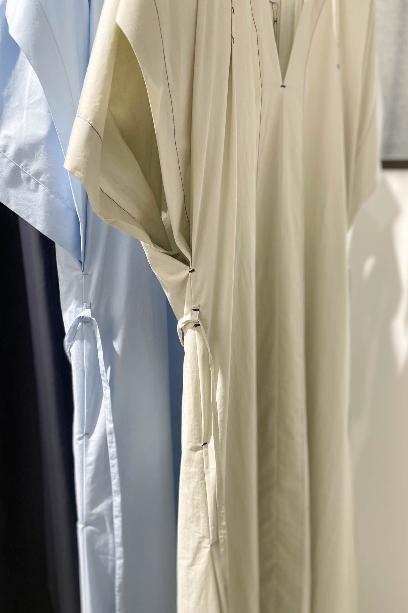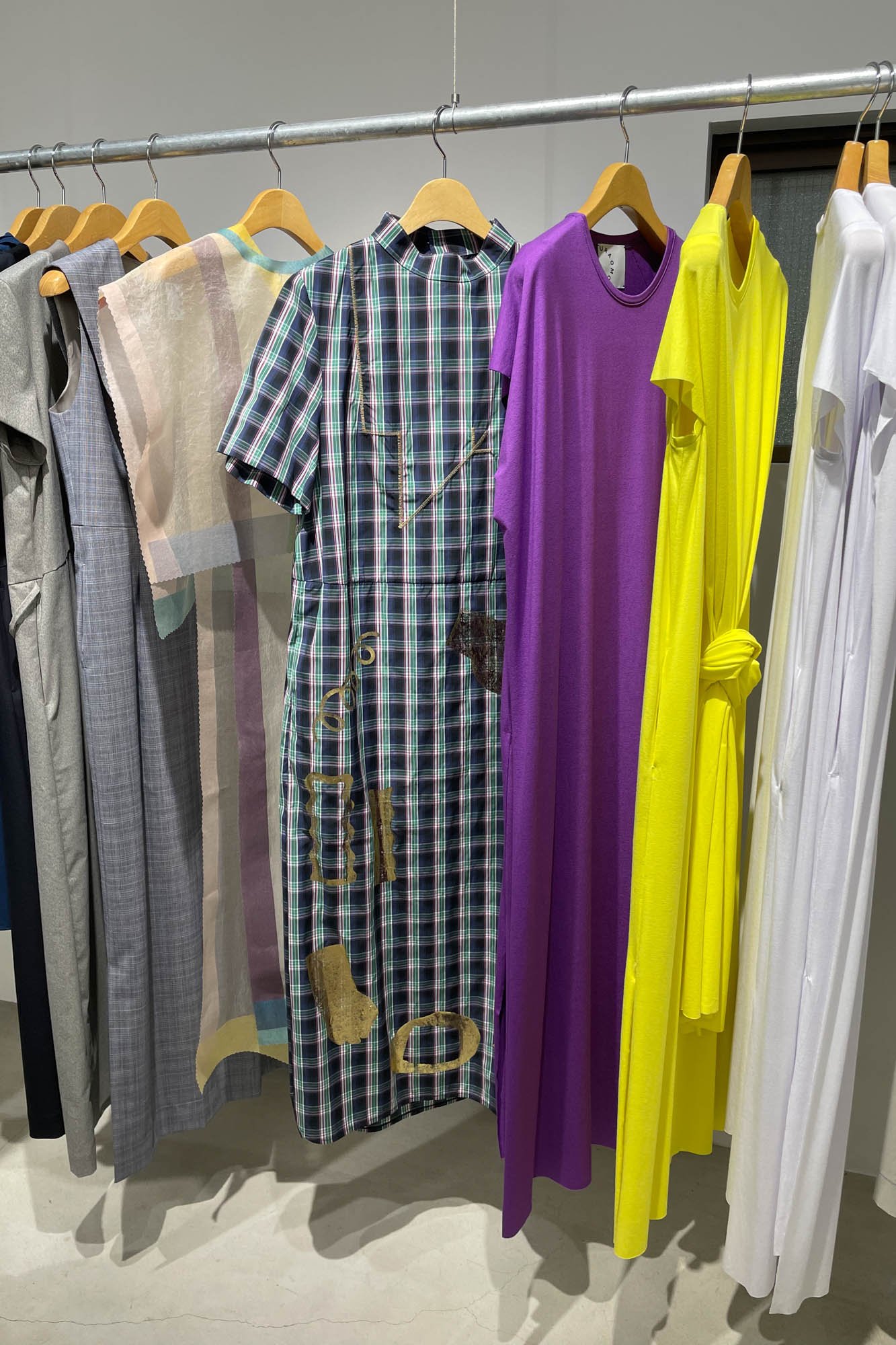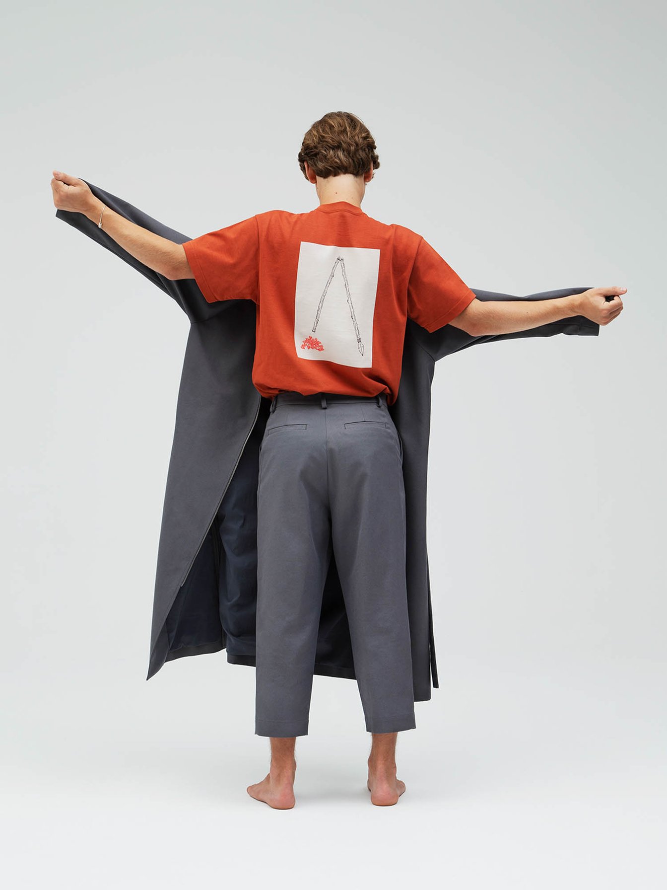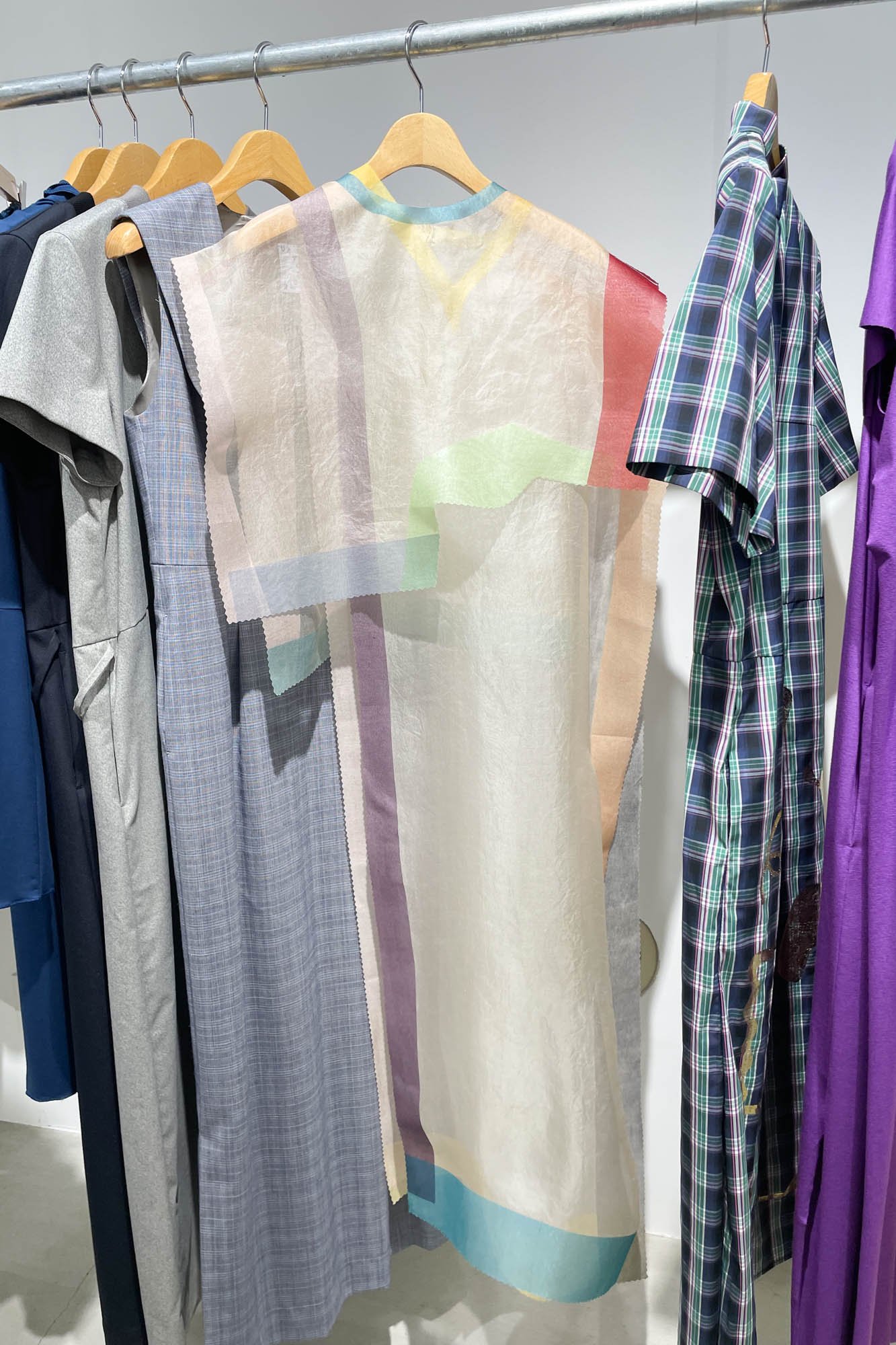 ファーストコレクションは「ヘ?ルリンて?生活してきた10年の中て?感し?たこと、何気ない会話、 記憶に残っている風景」をテーマに、全22アイテムを製作。ウィメンズでは2枚の長方形の布を折り込み、シルエットとボリュームを出したドレスをはじめ、淡いマルチカラーで縁取られた薄手のファブリックを重ねたドレス、厚手の生地のコートとパンツのセットアップや撥水加工が施されたテクニカルウェアのような質感のブルゾンジャケットやサイドにプリーツが施されたワイドパンツなどをラインナップ。所々に金の箔フ?リントやペイントのグラフィックなど奥山が手掛けたドローイングのデザイン要素が取り入れられているほか、ベーシックなウェアでも実際に着た時にどこか違和感を感じたり、発見がある服作りを目指し、素材やボリューム感、ステッチやスリット、プリーツなどのディテールなど細部にまでこだわった。