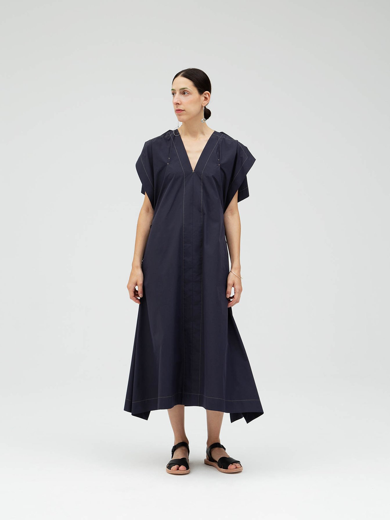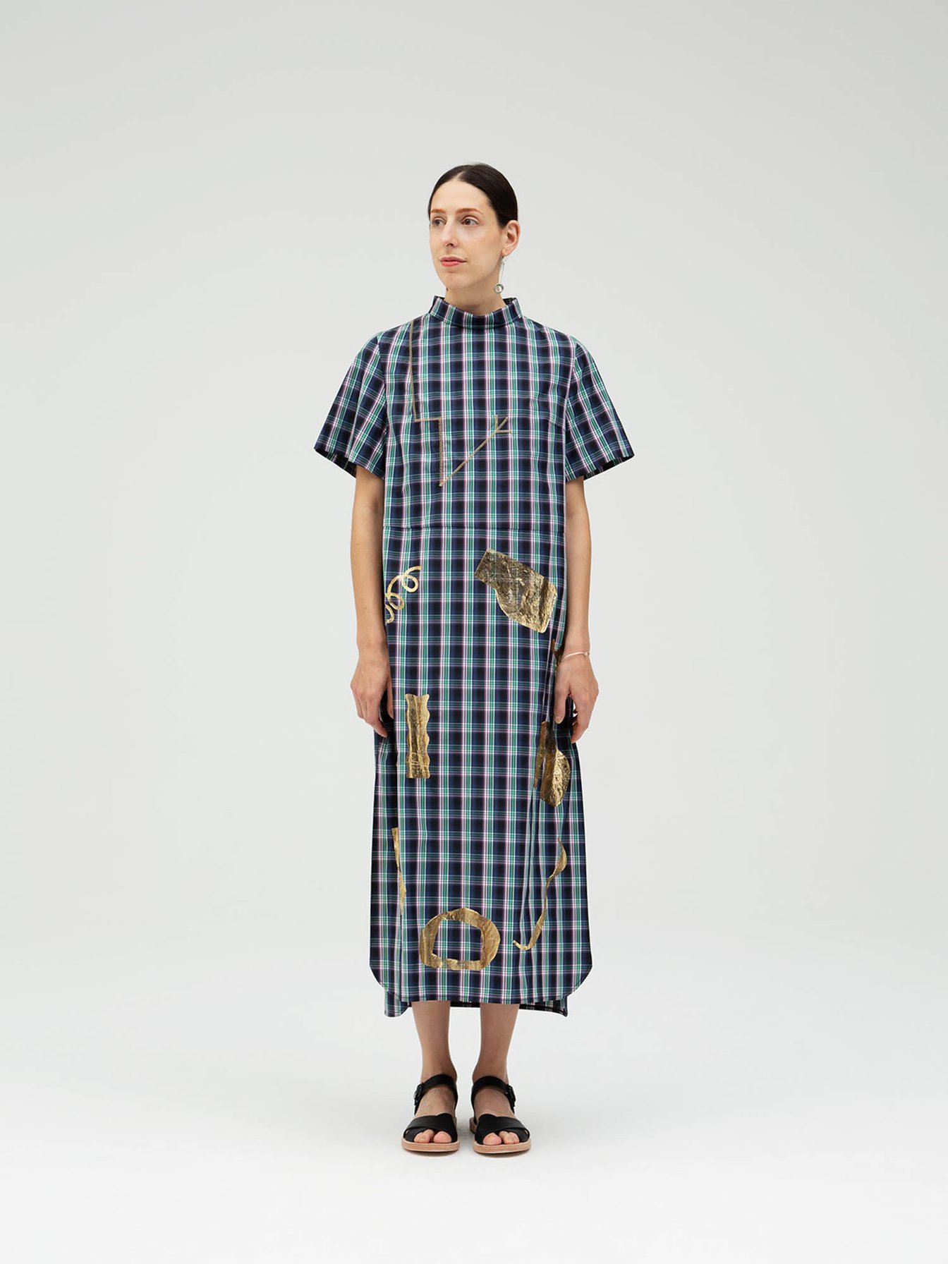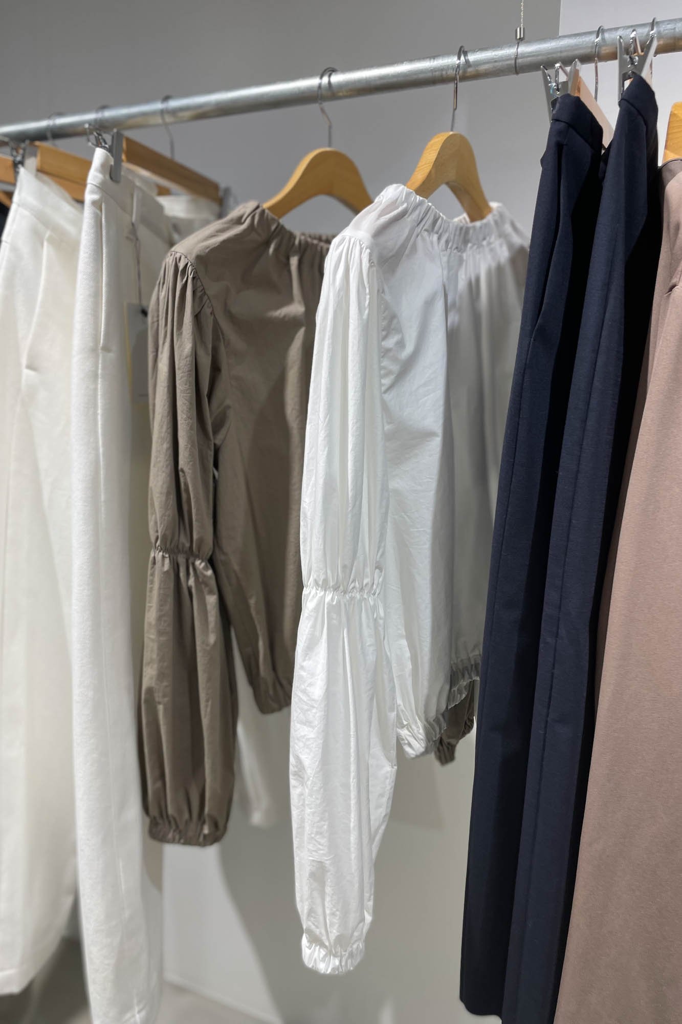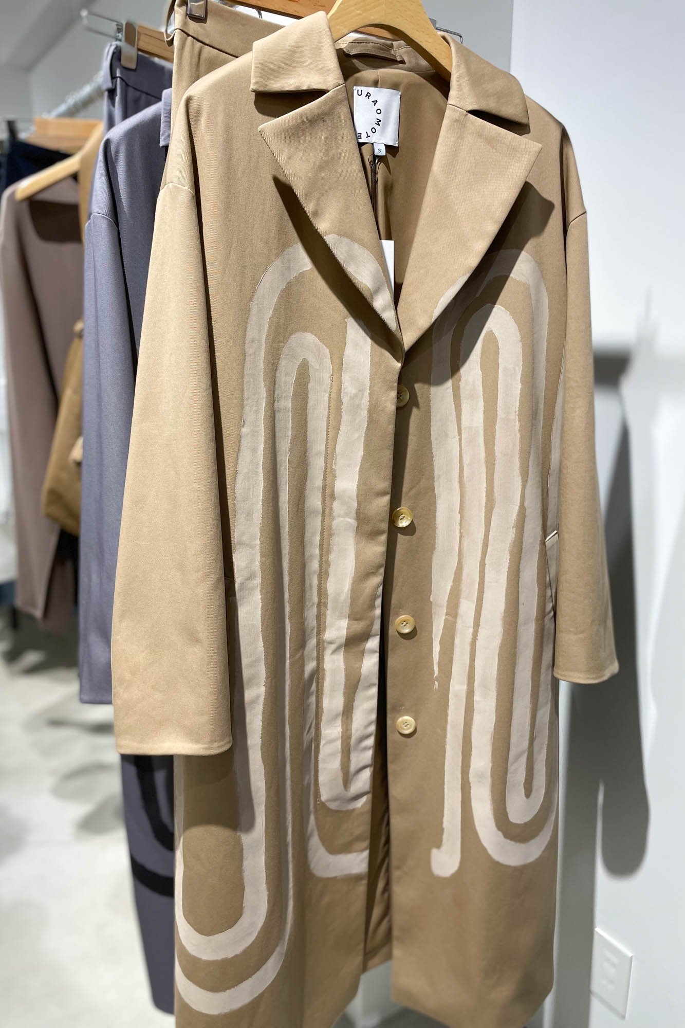 ファーストコレクションは「ヘ?ルリンて?生活してきた10年の中て?感し?たこと、何気ない会話、 記憶に残っている風景」をテーマに、全22アイテムを製作。ウィメンズでは2枚の長方形の布を折り込み、シルエットとボリュームを出したドレスをはじめ、淡いマルチカラーで縁取られた薄手のファブリックを重ねたドレス、厚手の生地のコートとパンツのセットアップや撥水加工が施されたテクニカルウェアのような質感のブルゾンジャケットやサイドにプリーツが施されたワイドパンツなどをラインナップ。所々に金の箔フ?リントやペイントのグラフィックなど奥山が手掛けたドローイングのデザイン要素が取り入れられているほか、ベーシックなウェアでも実際に着た時にどこか違和感を感じたり、発見がある服作りを目指し、素材やボリューム感、ステッチやスリット、プリーツなどのディテールなど細部にまでこだわった。
