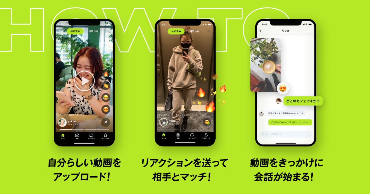 主にZ世代に向けたアプリで、UIはTikTok?Instagramのリール機能に類似している。SNSを見る感覚で相手を探せることが特徴だ。動画を視聴し、気になった相手の動画に対してリアクションを送ることで会話がスタートするため、自然な流れで出会いが生まれやすいというメリットがある。
