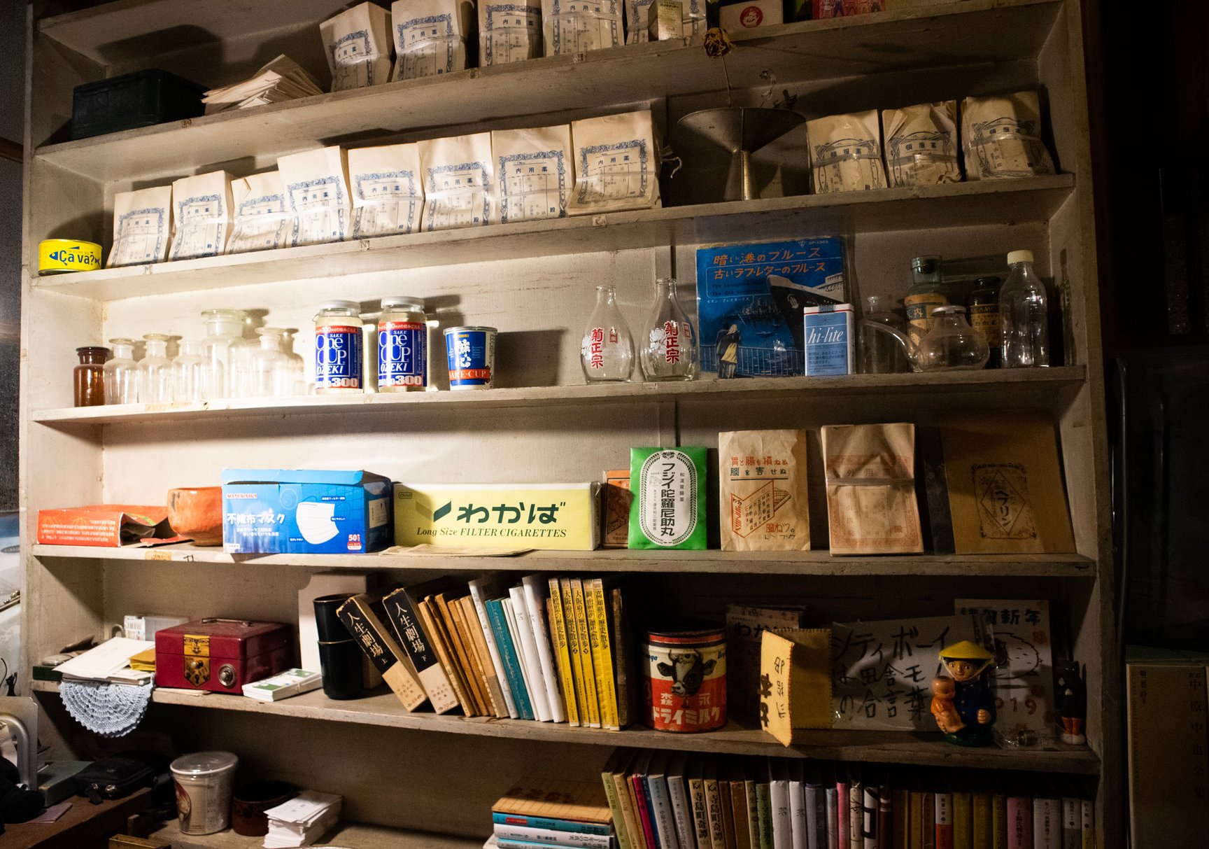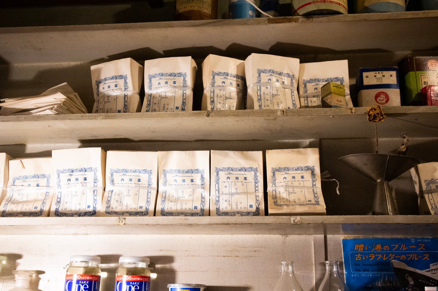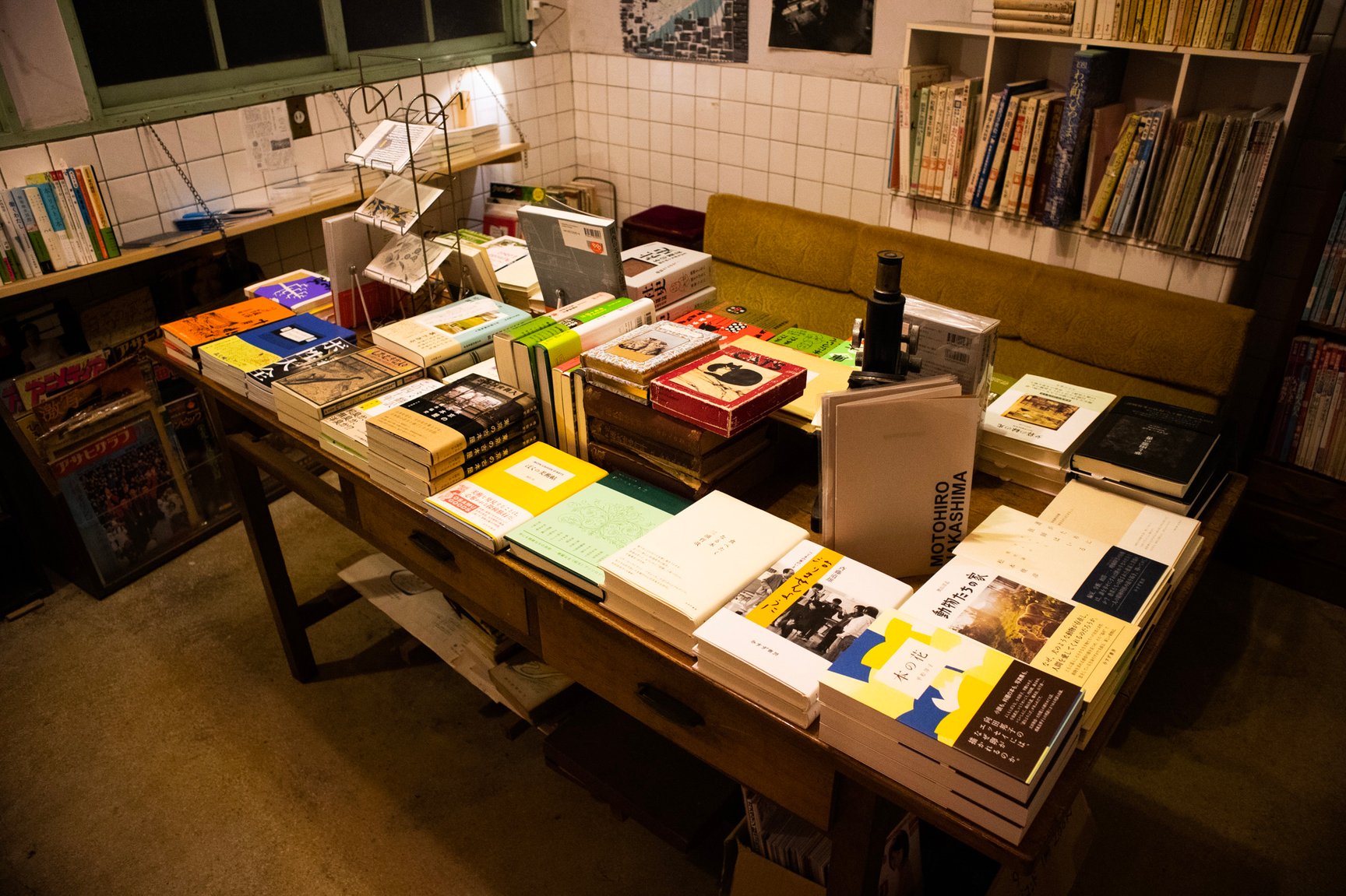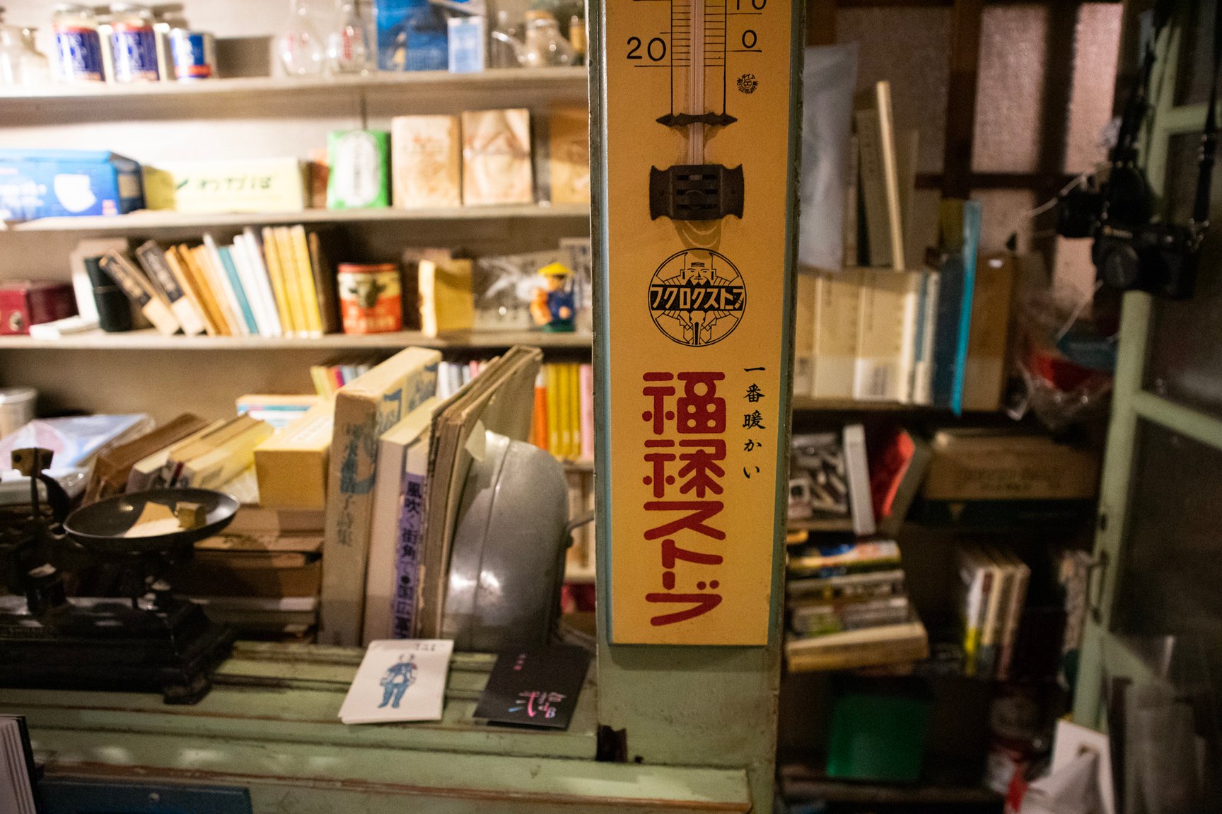 店舗の内装は診療所だった当時の面影を残した古い佇まい。薬袋やガラスの薬瓶、顕微鏡など病院で使われていた道具が随所に並び、店内には深夜ラジオが微かに流れている。棚に入りきらなかった書籍は棚の近くに山積みされているほか、旧式の扇風機や、レトロなポスター、やかんが置かれた石油ストーブ、形や色がそれぞれ異なる古びた椅子、熊の置き物など、昭和で時間が止まったような品々が雑多に並んでいるが、不思議と統一感のある空間に仕上がっている。店主の藤井氏によるとその多くは譲り受けたものや、拾ってきたものを思うがままに置いただけだという。