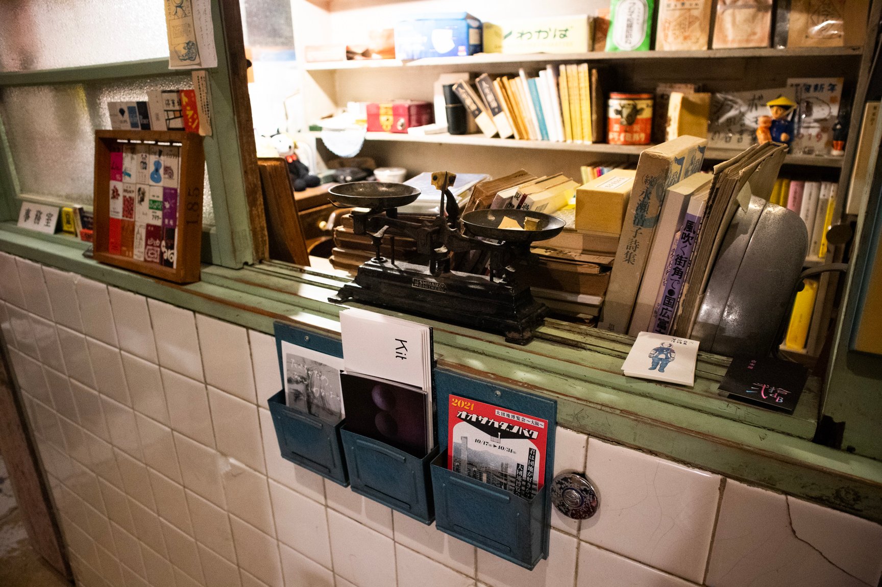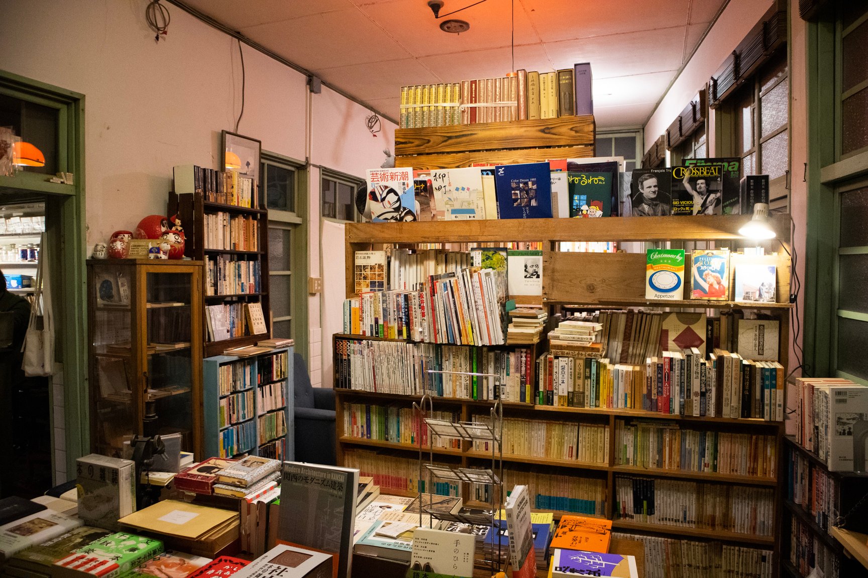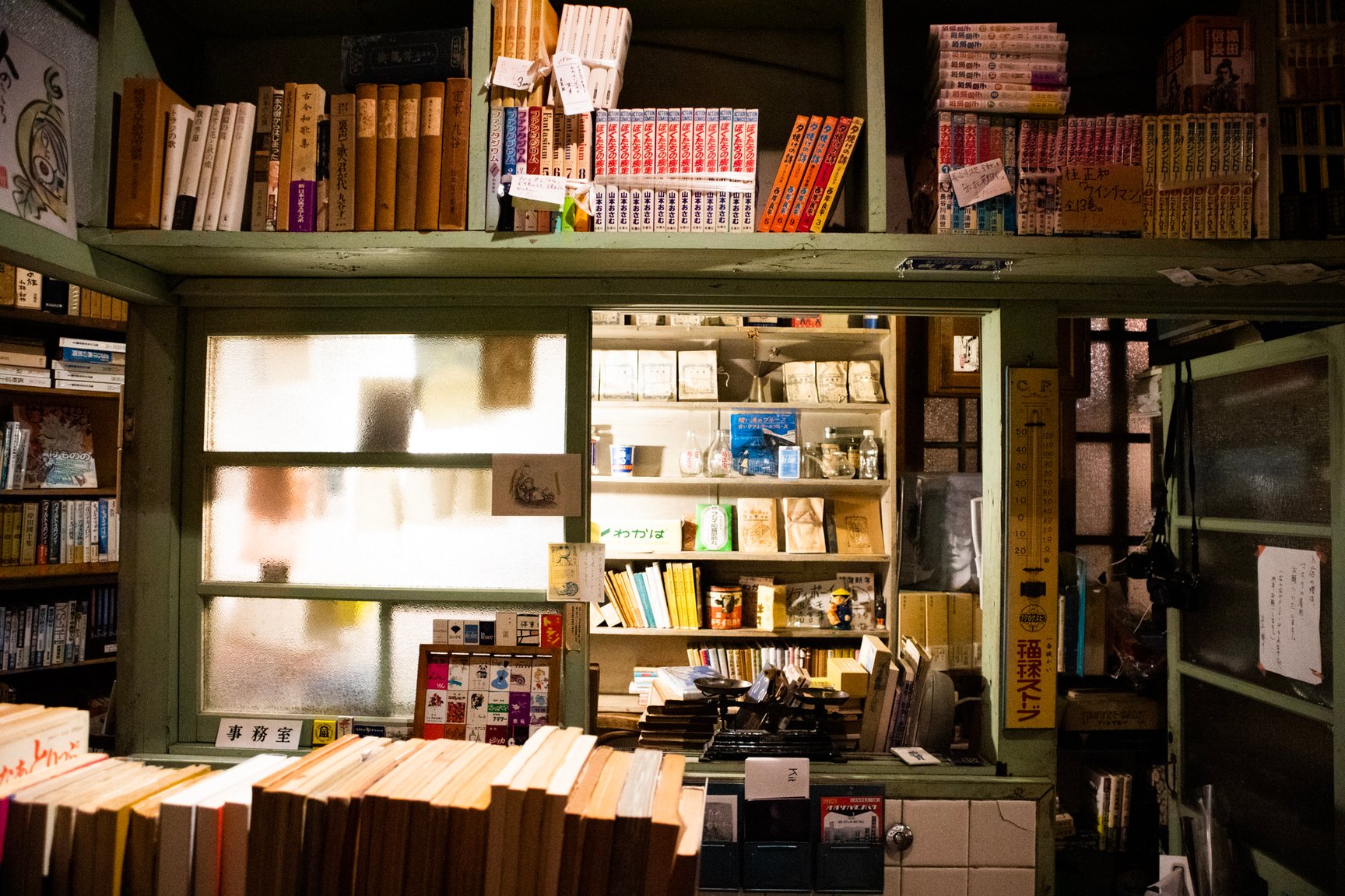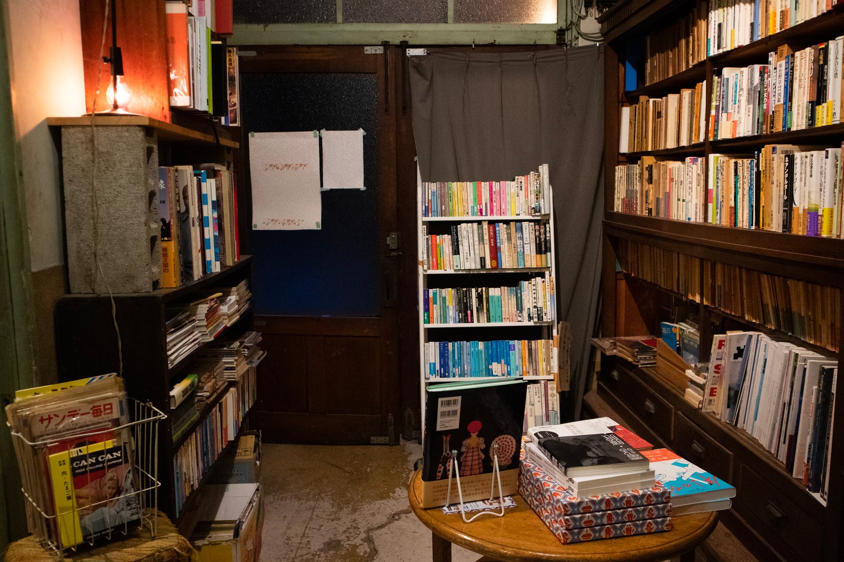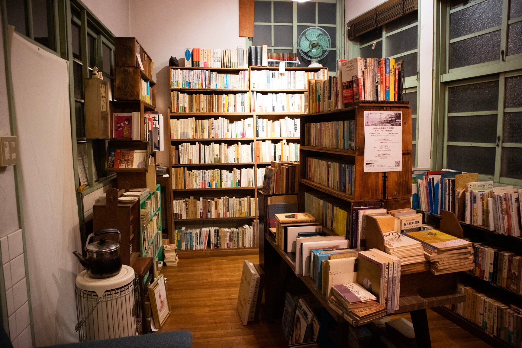 店舗の内装は診療所だった当時の面影を残した古い佇まい。薬袋やガラスの薬瓶、顕微鏡など病院で使われていた道具が随所に並び、店内には深夜ラジオが微かに流れている。棚に入りきらなかった書籍は棚の近くに山積みされているほか、旧式の扇風機や、レトロなポスター、やかんが置かれた石油ストーブ、形や色がそれぞれ異なる古びた椅子、熊の置き物など、昭和で時間が止まったような品々が雑多に並んでいるが、不思議と統一感のある空間に仕上がっている。店主の藤井氏によるとその多くは譲り受けたものや、拾ってきたものを思うがままに置いただけだという。