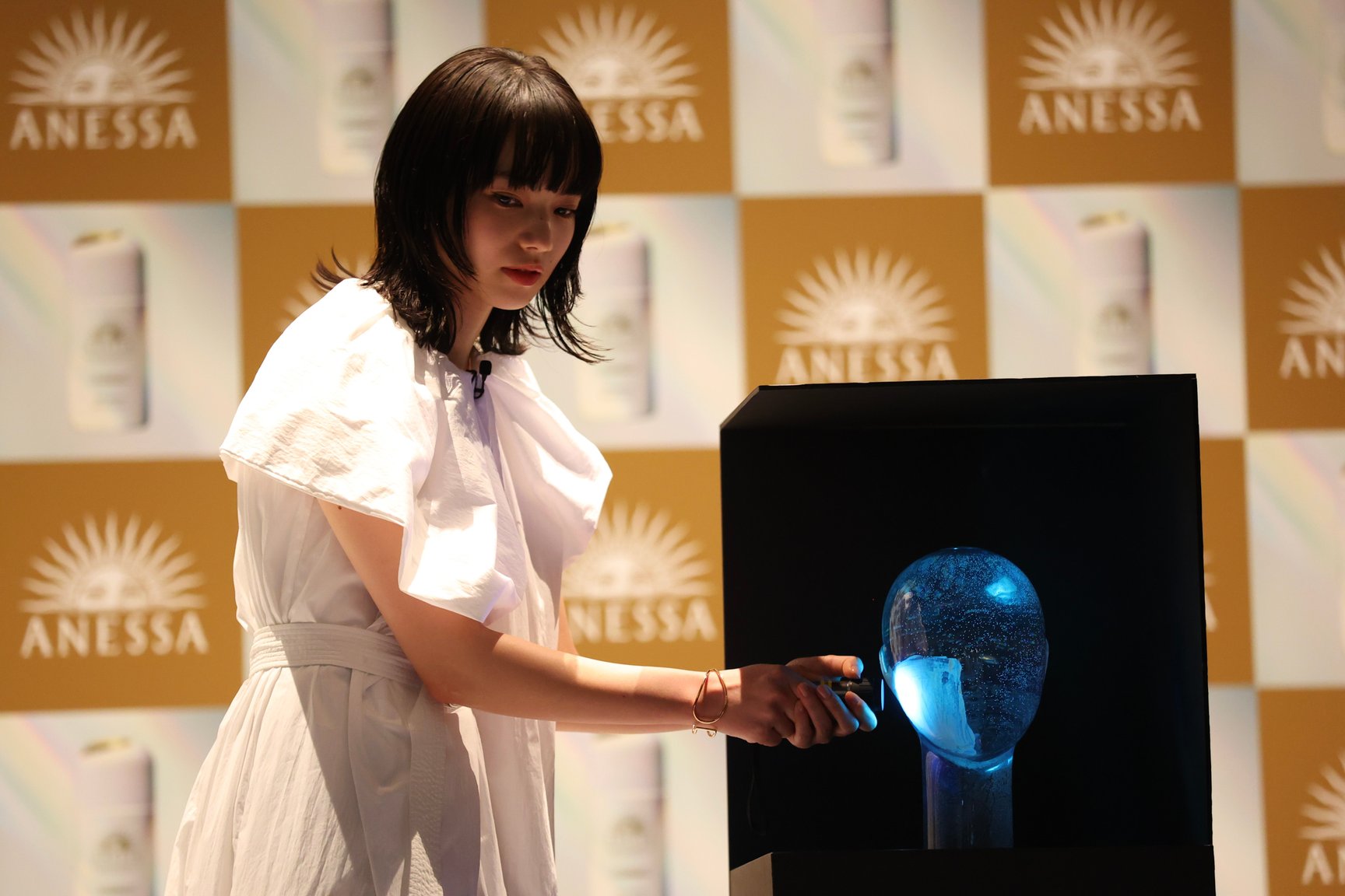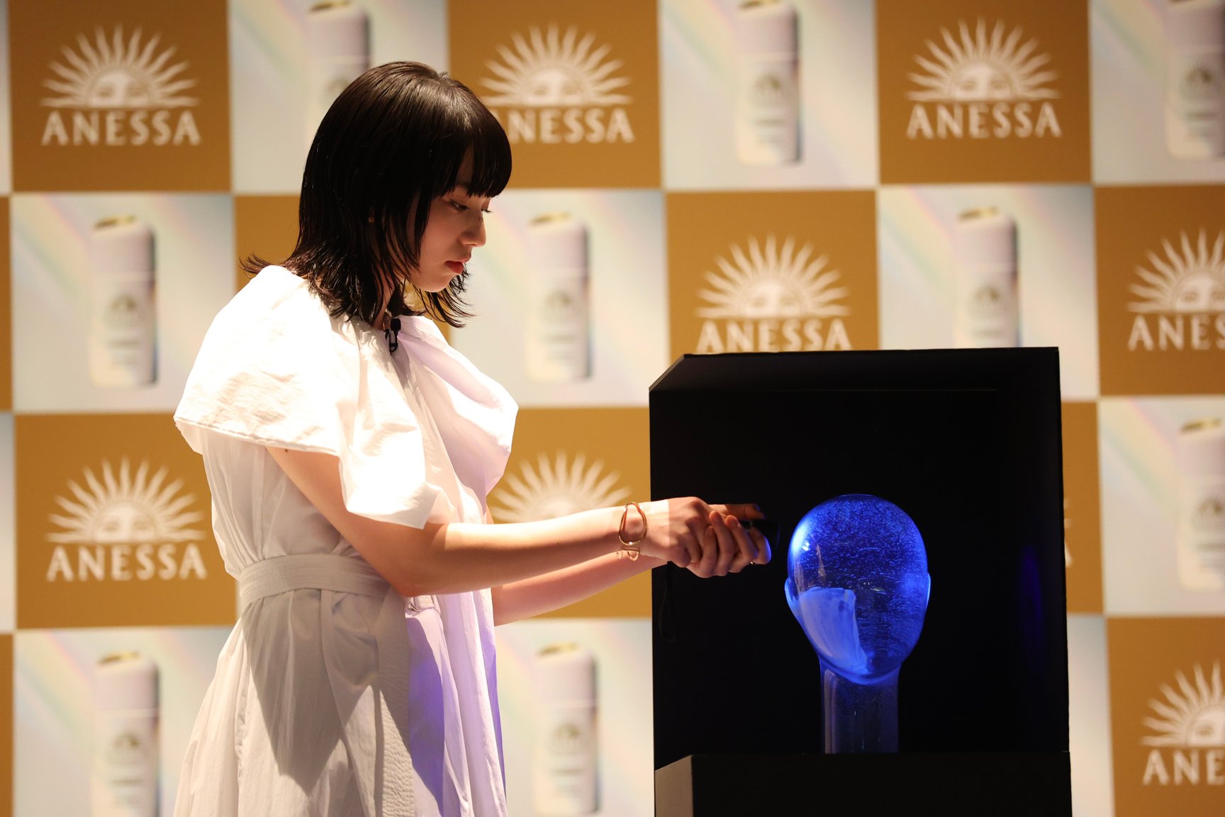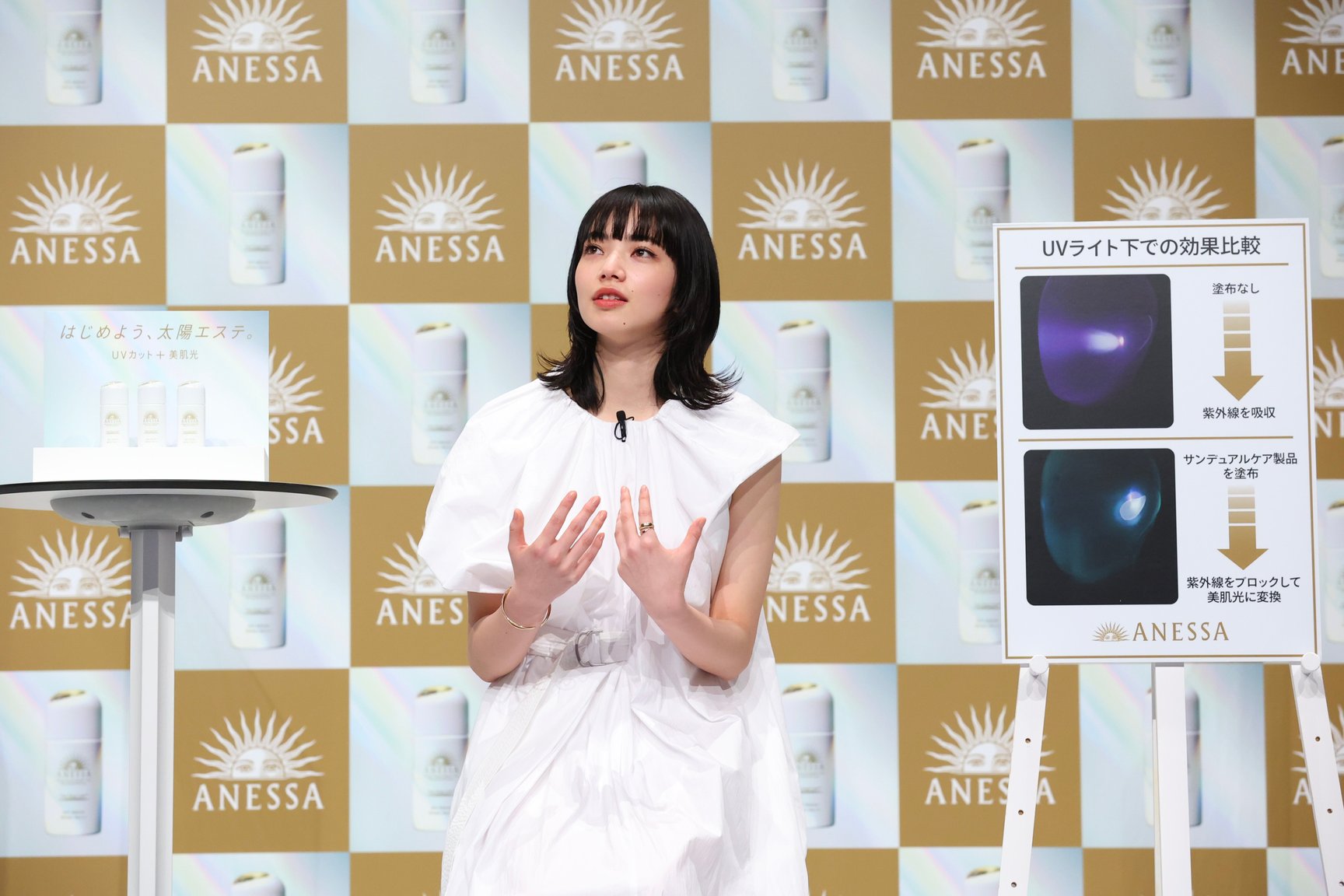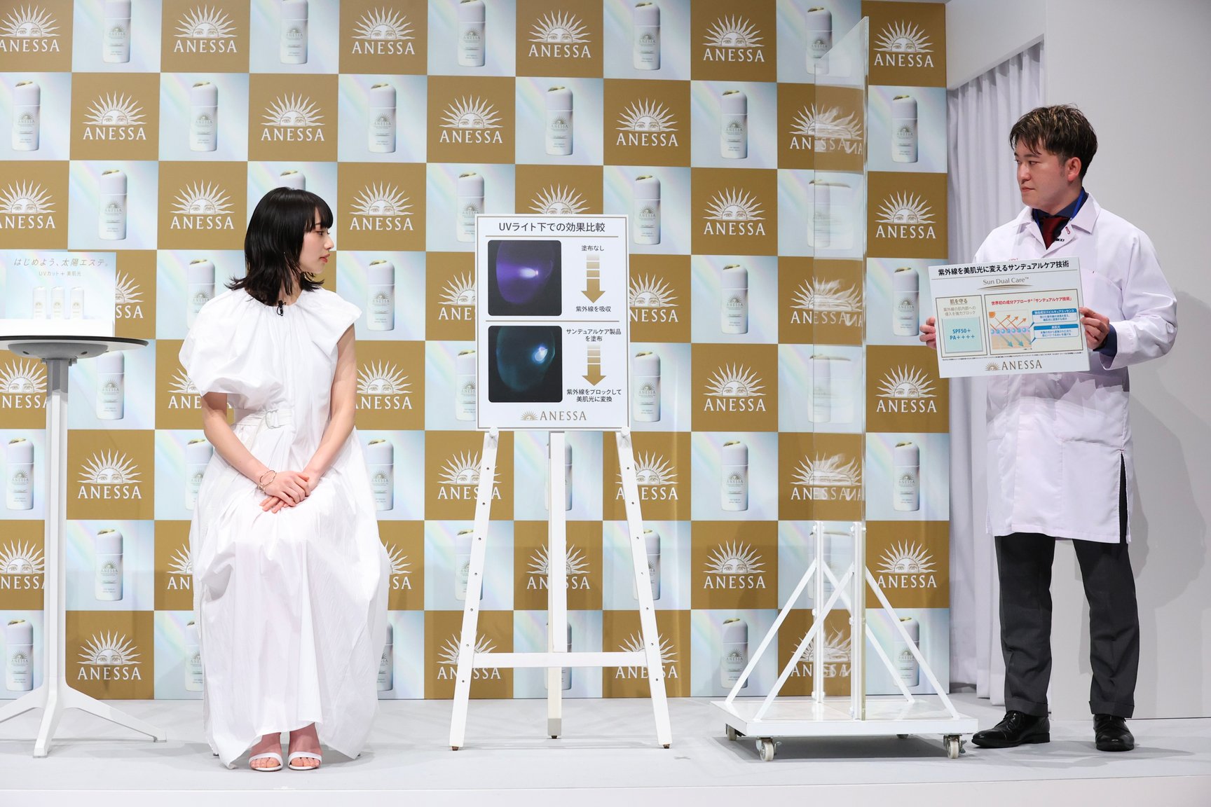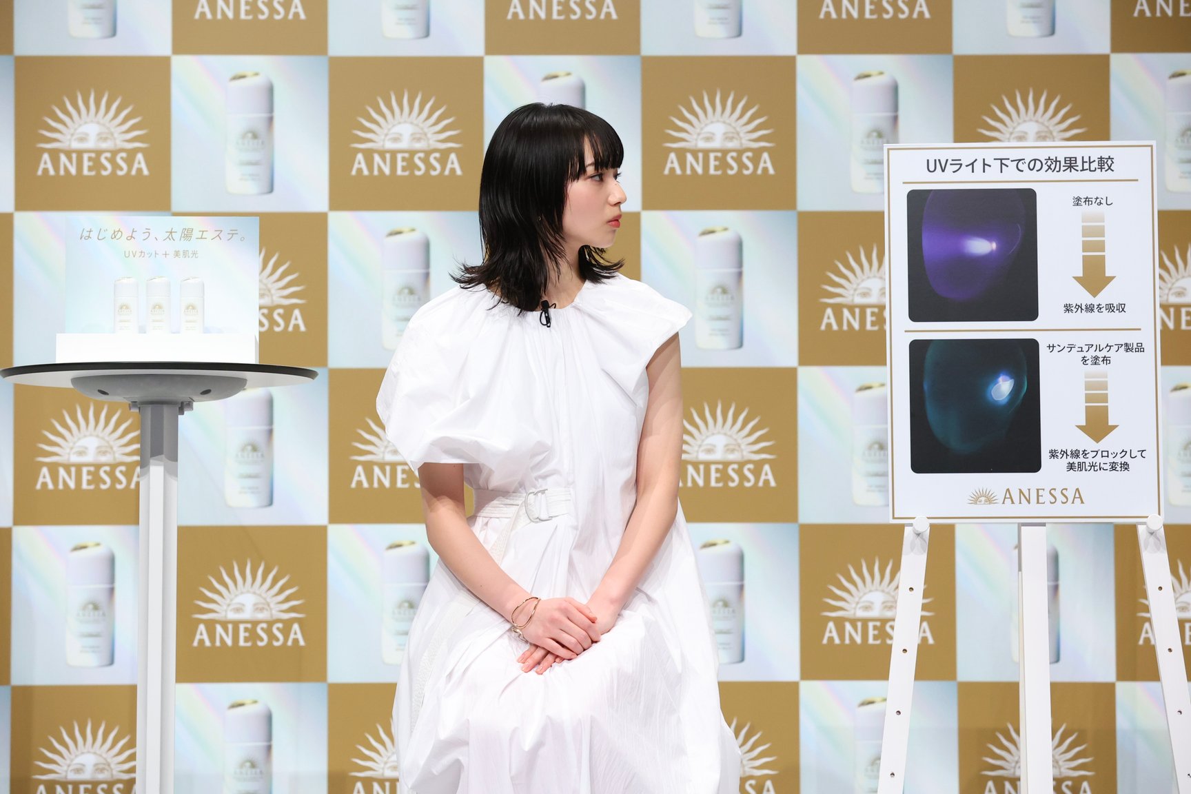 ステーシ?上て?は資生堂研究員が紫外線を美肌光に変換する技術のテ?モンストレーションを実施。顔の下半分のみにサンテ?ュアルケア製品を塗布したマネキンを用意し、UVライトを照射して上半分との違いを比較した。結果、下半分た?け紫外線の紫色の光か?美肌光に変換されていることか?検証されると、小松は驚きの表情。「実際にテ?モを見て、すこ?いものか?誕生したなと実感しました。アネッサて? UV ケアをして肌と向き合って、未来の肌につなけ?ていけたらいいなと思っています」とコメントした。