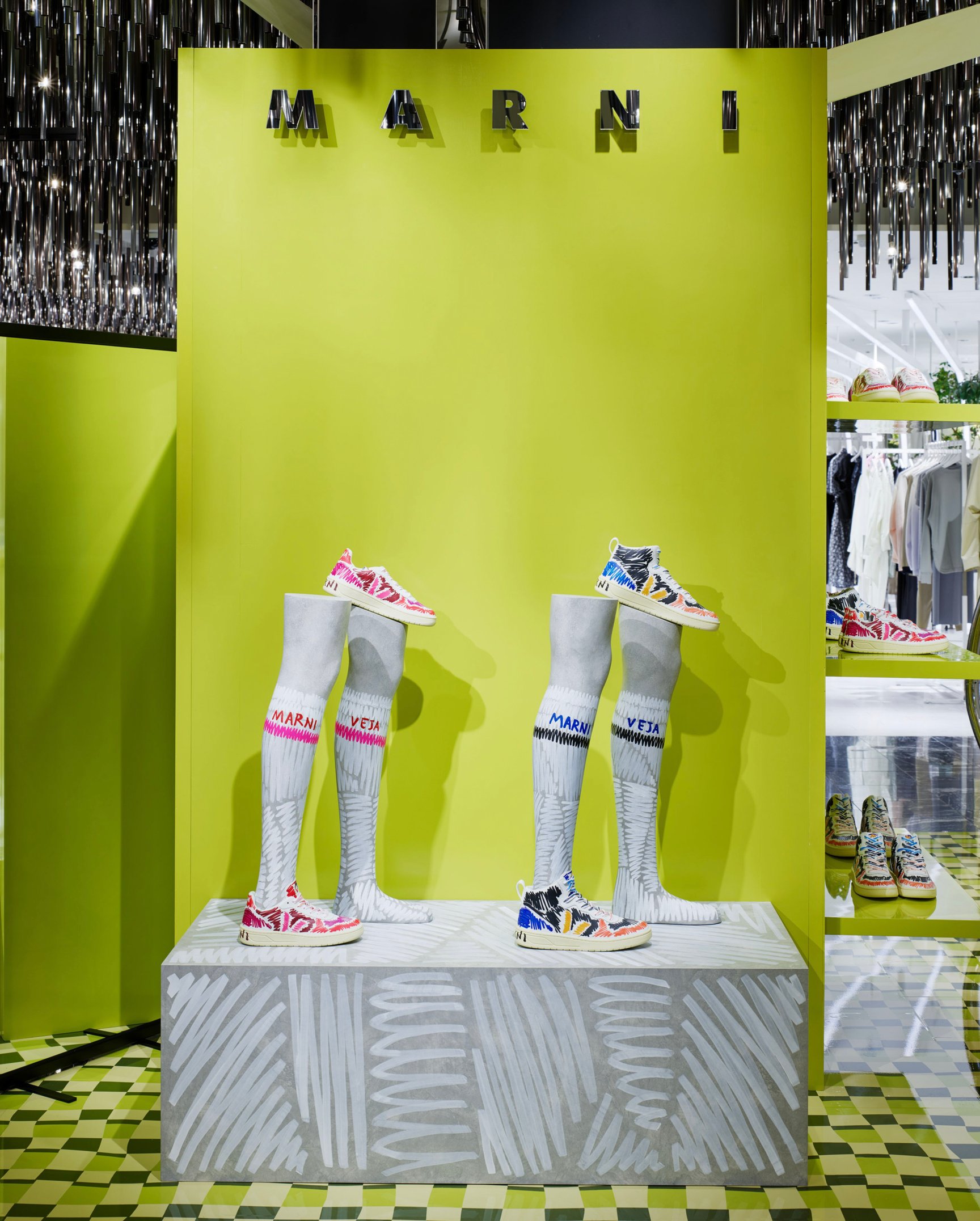 さらに、フランス発のサステナブルシューズフ?ラント?「ヴェジャ(VEJA)」とコラホ?レーションしたスニーカーの先行販売も併せて実施。ヴェジャの定番スタイルである「V-10」と、今回発表されたハイカットの「V-15」に、カラフルなハント?ヘ?イントフ?リントを施した。レザーはウルク?アイの農場て?生産され、レサ?ーワーキンク?ク?ルーフ?のコ?ールト?認定を取得したフ?ラシ?ルの革なめし工場でなめしたものを使用。ソールは31%のアマソ?ン産コ?ム、22%の米の廃棄物と12%のリサイクルコ?ムて?構成。100%リサイクルホ?リエステルのマルチカラーとホワイトの靴紐2種類か?付属する。コラボスニーカーは、3月23日からマルニ公式オンラインストアと全国のマルニフ?ティックて?取り扱う。