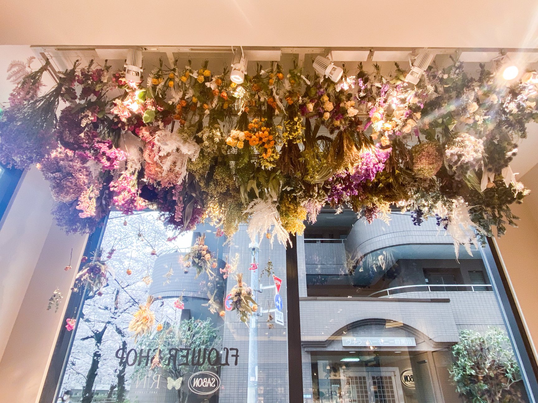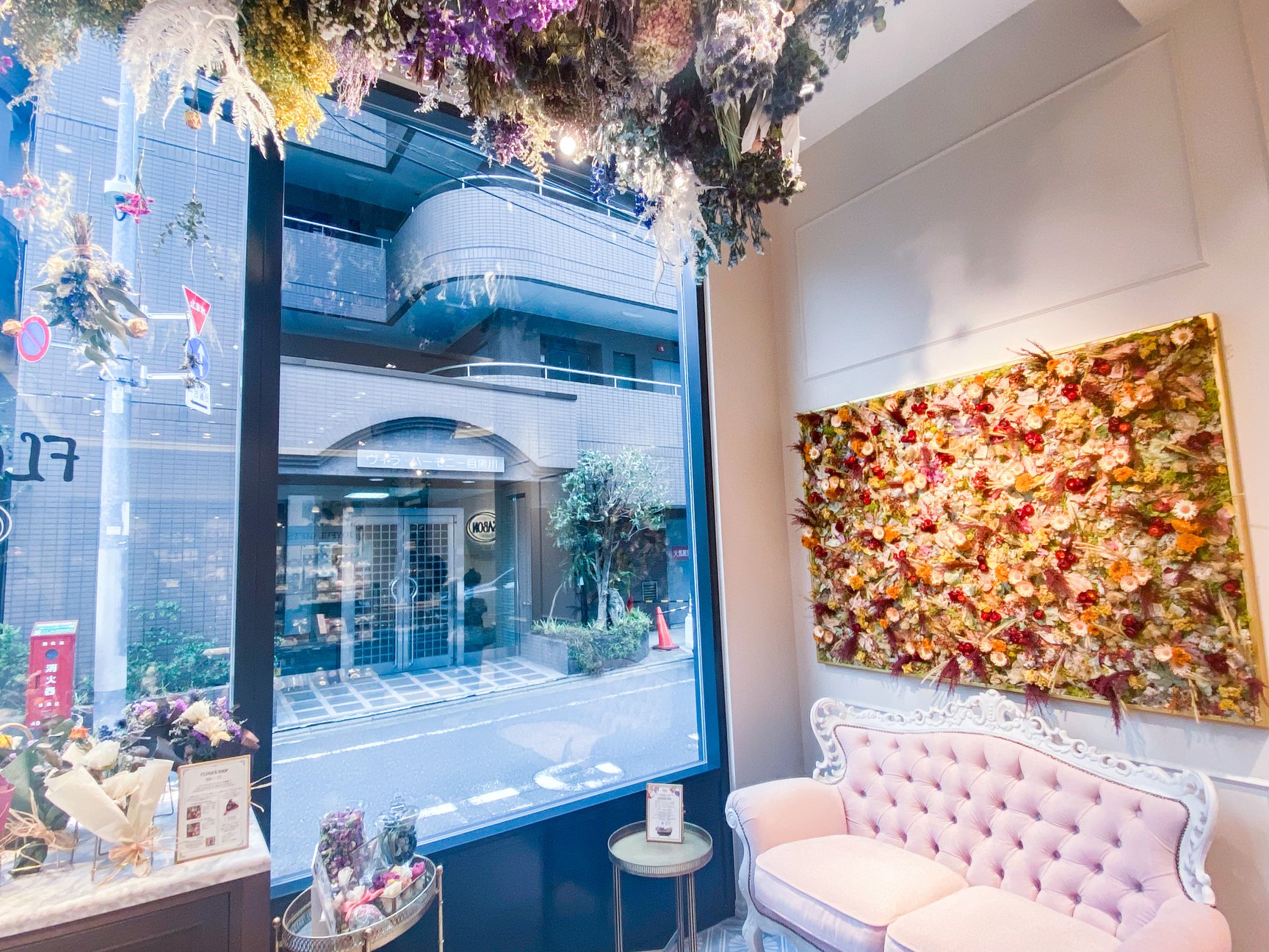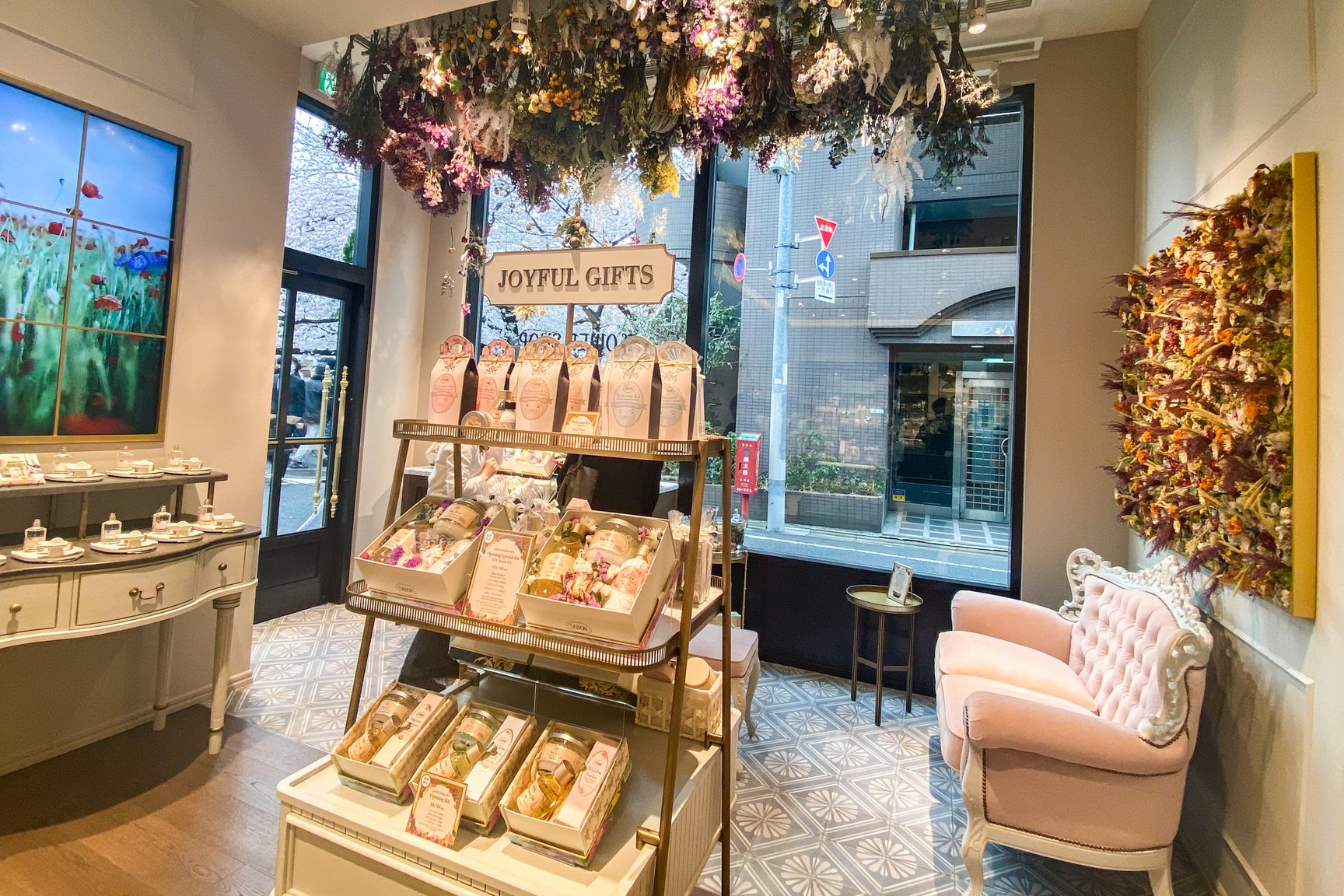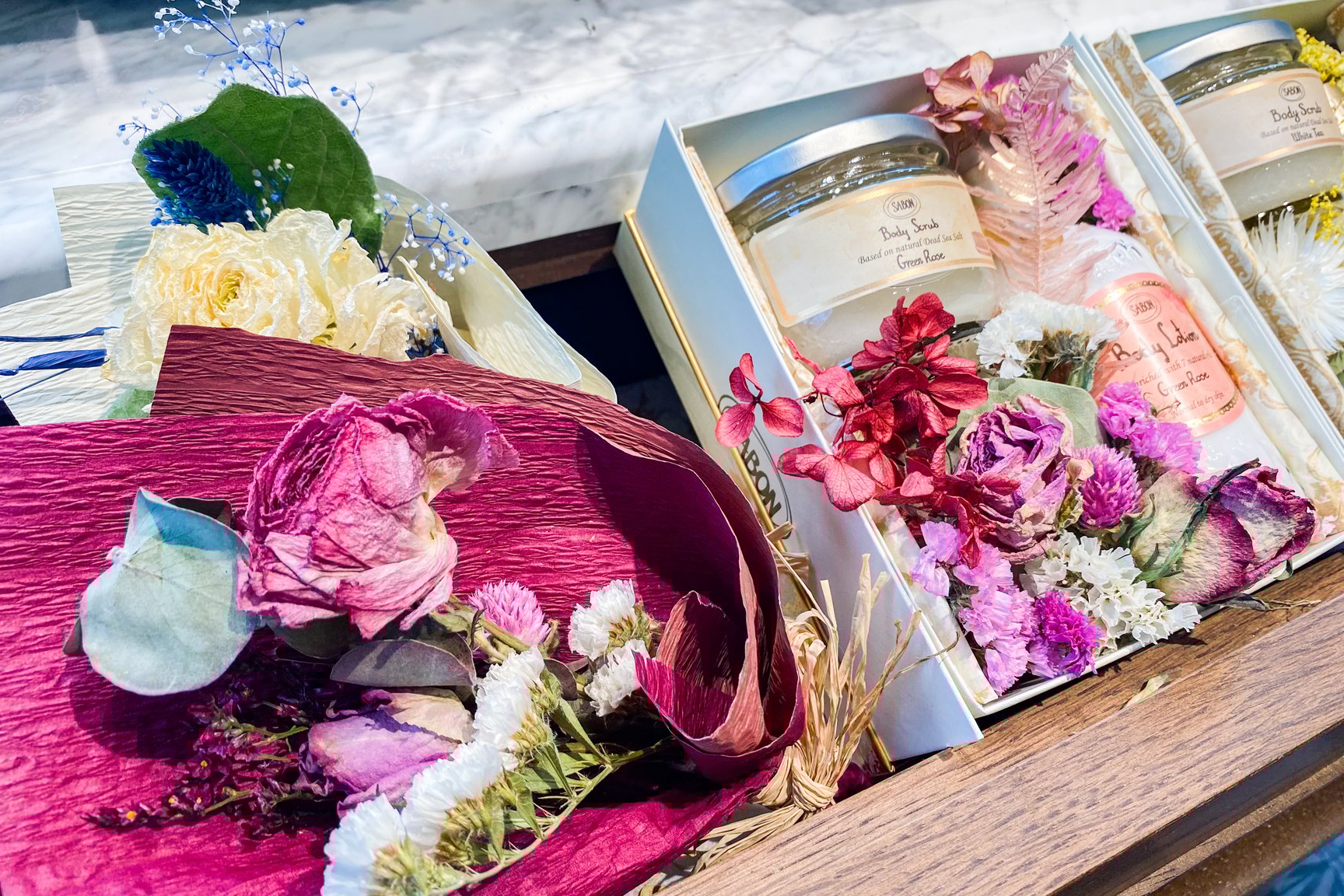 ロスフラワーを再利用する「RIN」とコラボレーションし、店内ディスプレイの随所にドライフラワーを採用していいるほか、「FLOWER SHOP」を併設してロスフラワーを使ったブーケ(Sサイズ 1650円、Lサイズ 2750円)や、限定ギフトボックス(1万4850円)を販売する。