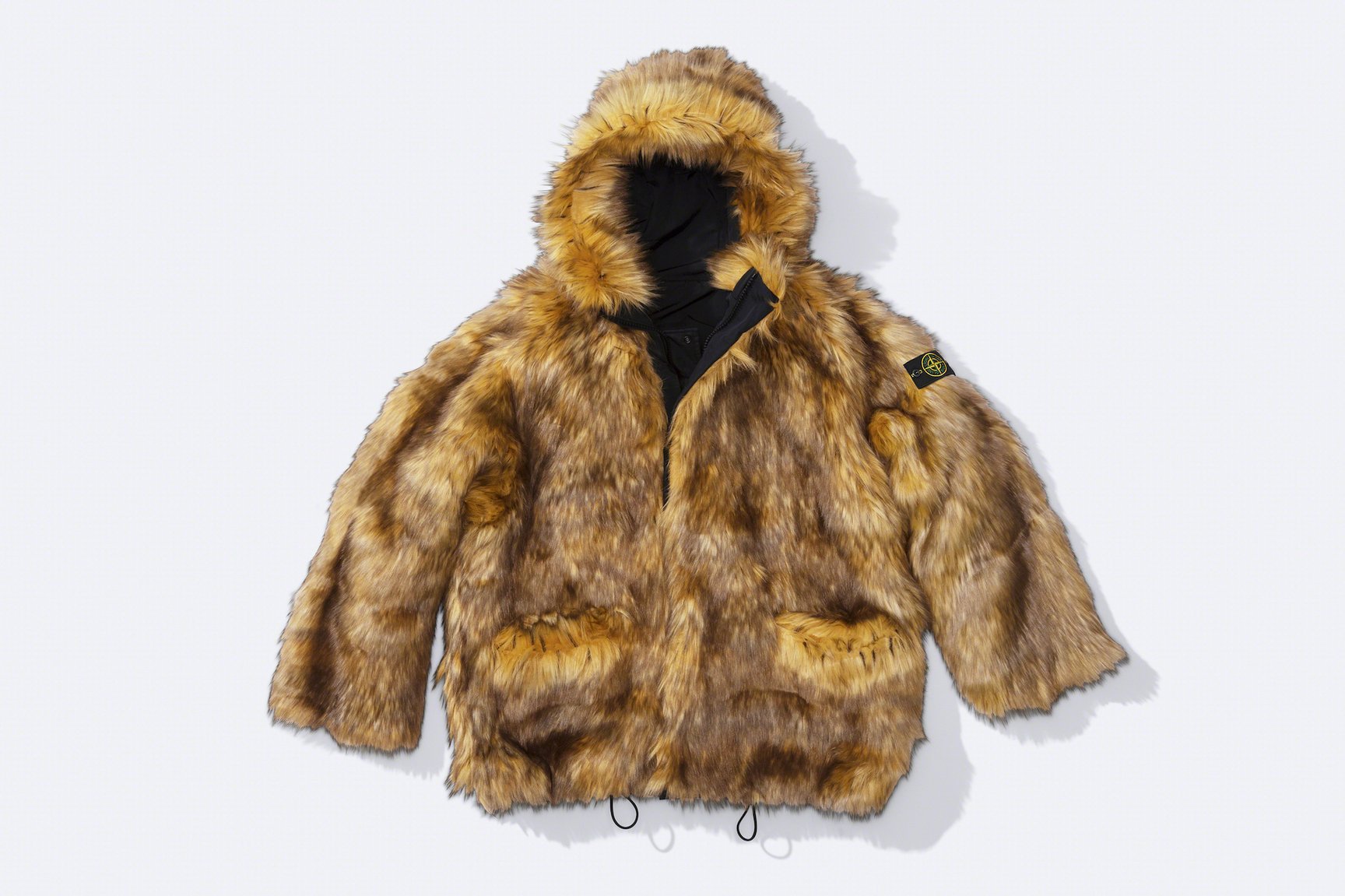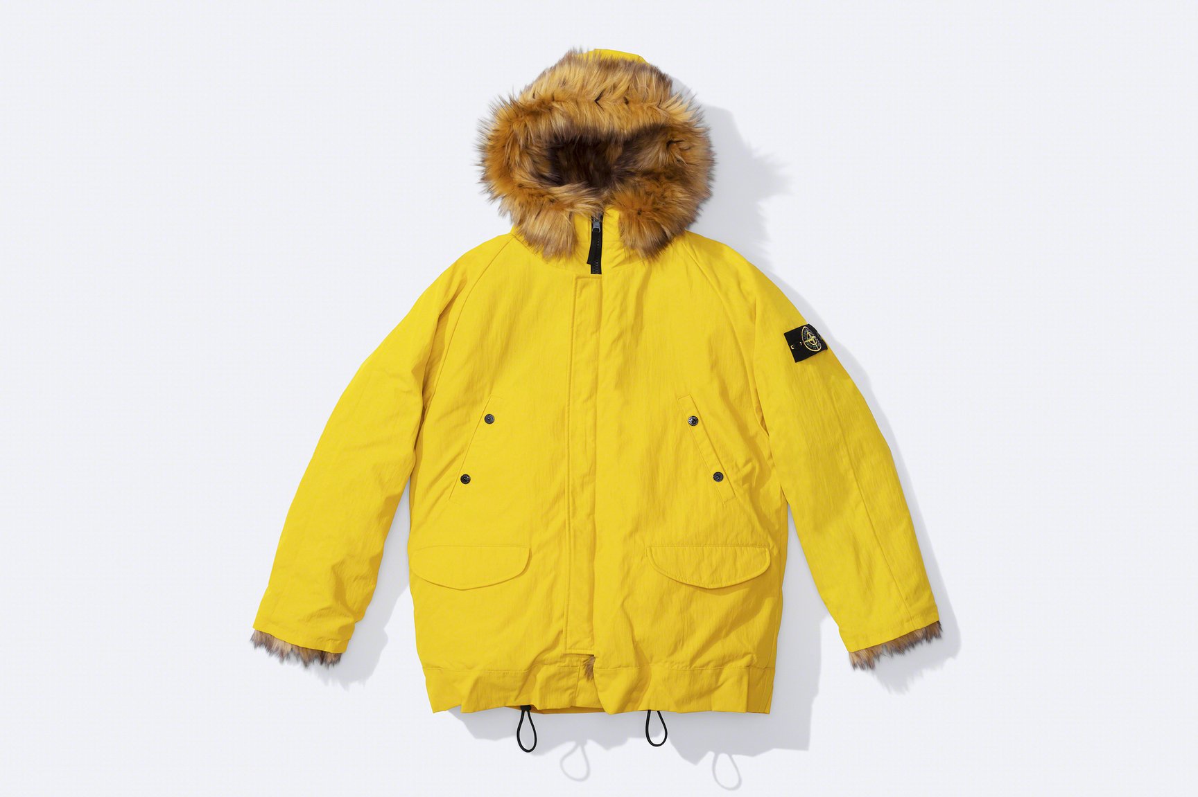 同コレクションでは、ストーンアイランドがコラボのために開発したオリジナルの素材を用いたアイテムをラインナップ。耐水性樹脂コーティングを施した「ナイロンリバーシブルフォックスファーパーカ」や、耐水性のコットンコーデュラ(CORDURA)で製作した「シェルジャケット」、熱に反応する顔料プリントを使用し、気温の変化によって色が変わる仕様のジャケット、パンツ、キャップのほか、「モナ?リザ」をプリントしたフード付きスウェットシャツやTシャツ、メッセンジャーバッグなどを展開する。