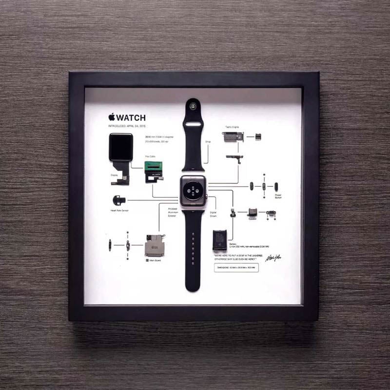 iPhoneシリーズは4S?SE?7など、AppleWatchは第1世代、PSPは1000および2000が作品に。どの作品も黒いフレームに白の背景紙というシンプルな組み合わせでデバイスの存在感が引き立っています。