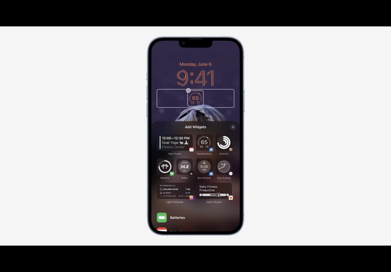 さらに、ウィジェットとして、アイコンのようなサイズのアプリを配置できるようになります。ロックを解除する必要なく、アクティビティの進捗状況やスケジュール、接続しているAirPodsなどのバッテリー残量を確認できるようになるというわけです。どこかで見たことがあるようなスタイルですが、デザインは、Apple Watchに採用されているコンプリケーションに似ています。