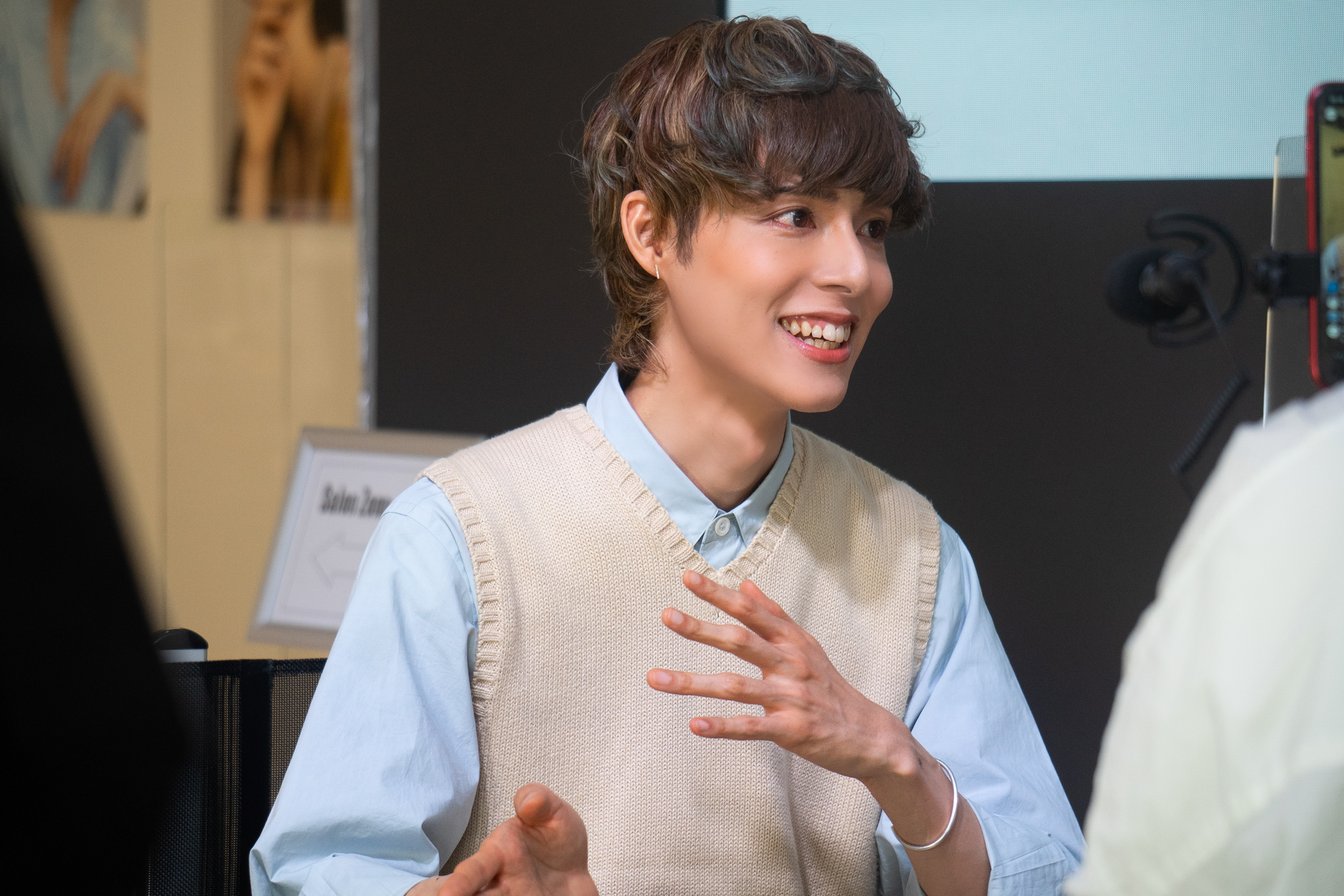 メイクを始めたきっかけもそれぞれだ。フゥジはコンプレックスだったまゆげのメイクからスタート。「最初は自分のまゆげが気に入らなくてメイクで整えたら、こんなに変わるんだってメイクの凄さを実感したんだよね」(フゥジ)。万太郎は「僕はニキビを隠したいと思ったのがきっかけ。最初はコンプレックスきっかけで始めメイクだけど、今は楽しむフェーズにいると思うんだよね。ファッションと同じような感覚で、楽しんでやってるっていうか」とメイクとの付き合い方に変化があったことを明かした。