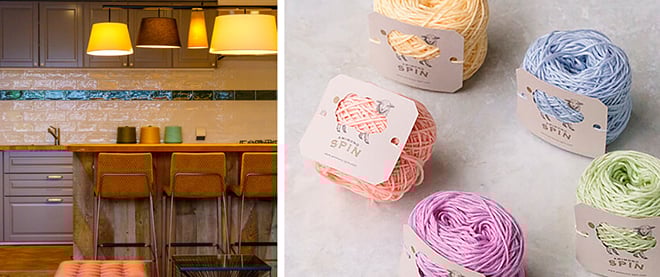 奥にはコーヒーやお酒もサーブできるカウンターも(左)。「AMIMONO SPIN」のオリジナル別注カラー。鮮やかなものだけでなく、優しい色合いの毛糸も(右)/写真提供:AMIMONO SPIN。