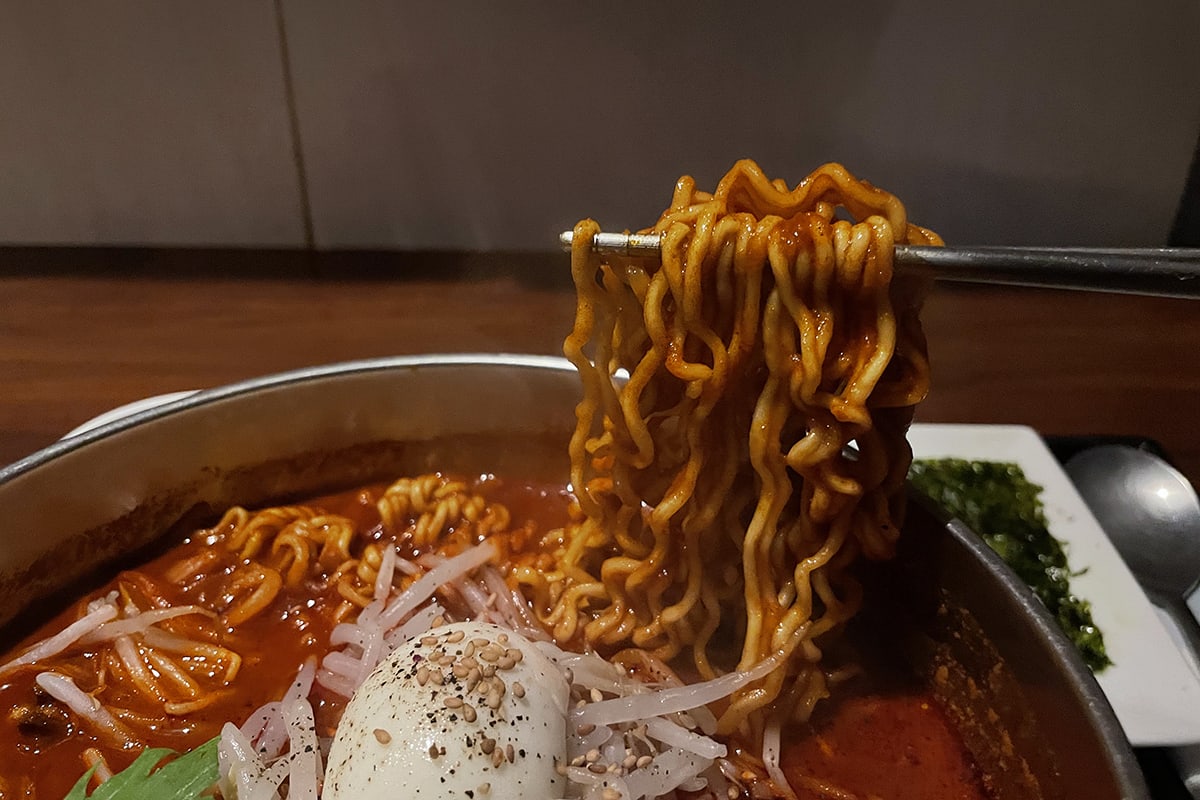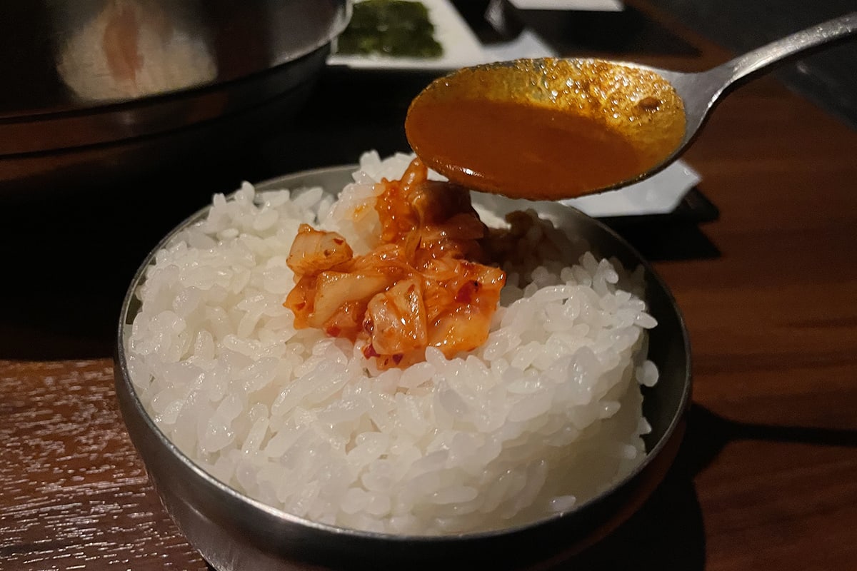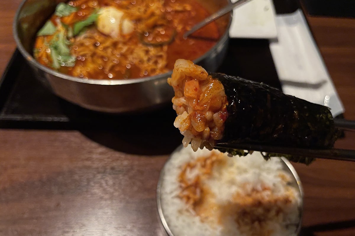 さらに、その最強コラボレーションに同じくサイドメニューでついてくる、韓国海苔を巻いて口の中へ。韓国海苔のほのかな塩味とキムチとスープの辛さと甘みが絶妙にマッチし、口の中が多幸感を溢れる。(この時すでにダイエットという文字は頭の中にはない)