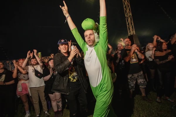 PRESS CLUBのモッシュピットに加わる、ヨッシーの着ぐるみ姿の男性。