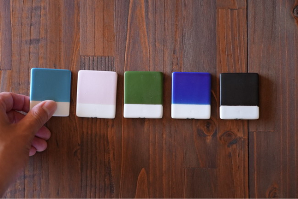 はじめに5色を選ぶと、その色の「見本タイル」が届く。これによって、スマホやPCの画面上ではわからない微妙な色の違いや質感を、直接手にとって確かめることができる。