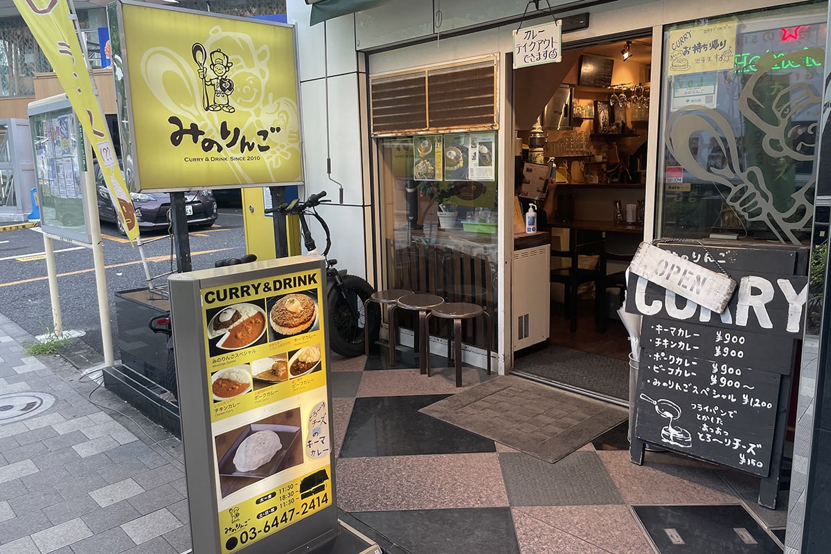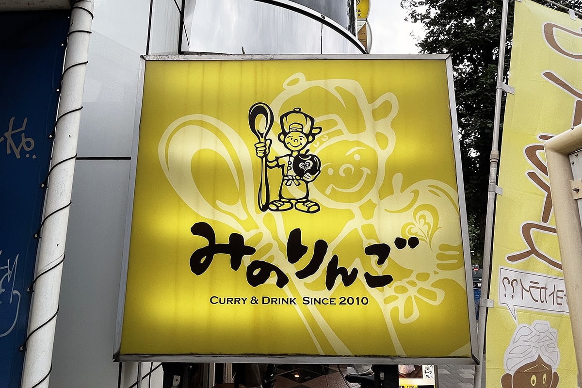 JR原宿駅のすぐ近く、黄色い看板が目印の「みのりんご」。2010年から原宿の地で親しまれる人気カレー店である。ウッドのカウンターなど、あたたかみある内装の店内にはカレーの良い匂いが立ち込めている。