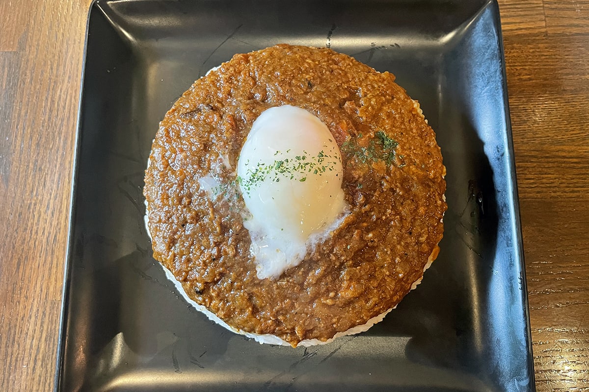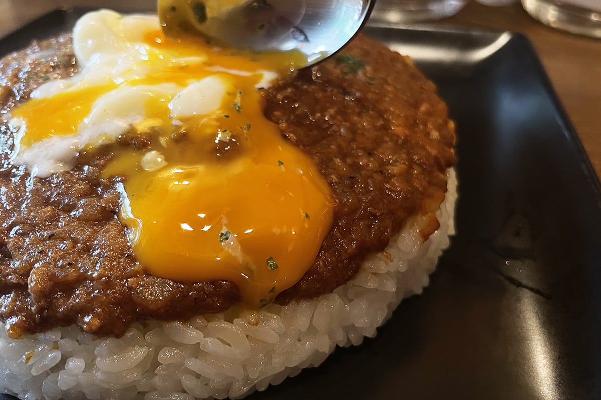 このカレーはなるほど、ここでしか食べられない味だ。ご飯とカレーの美味なる崖の上に鎮座する温玉をくずせば、よりまろやかな味わいに。あっという間に食べ進められてしまう美味しさである。