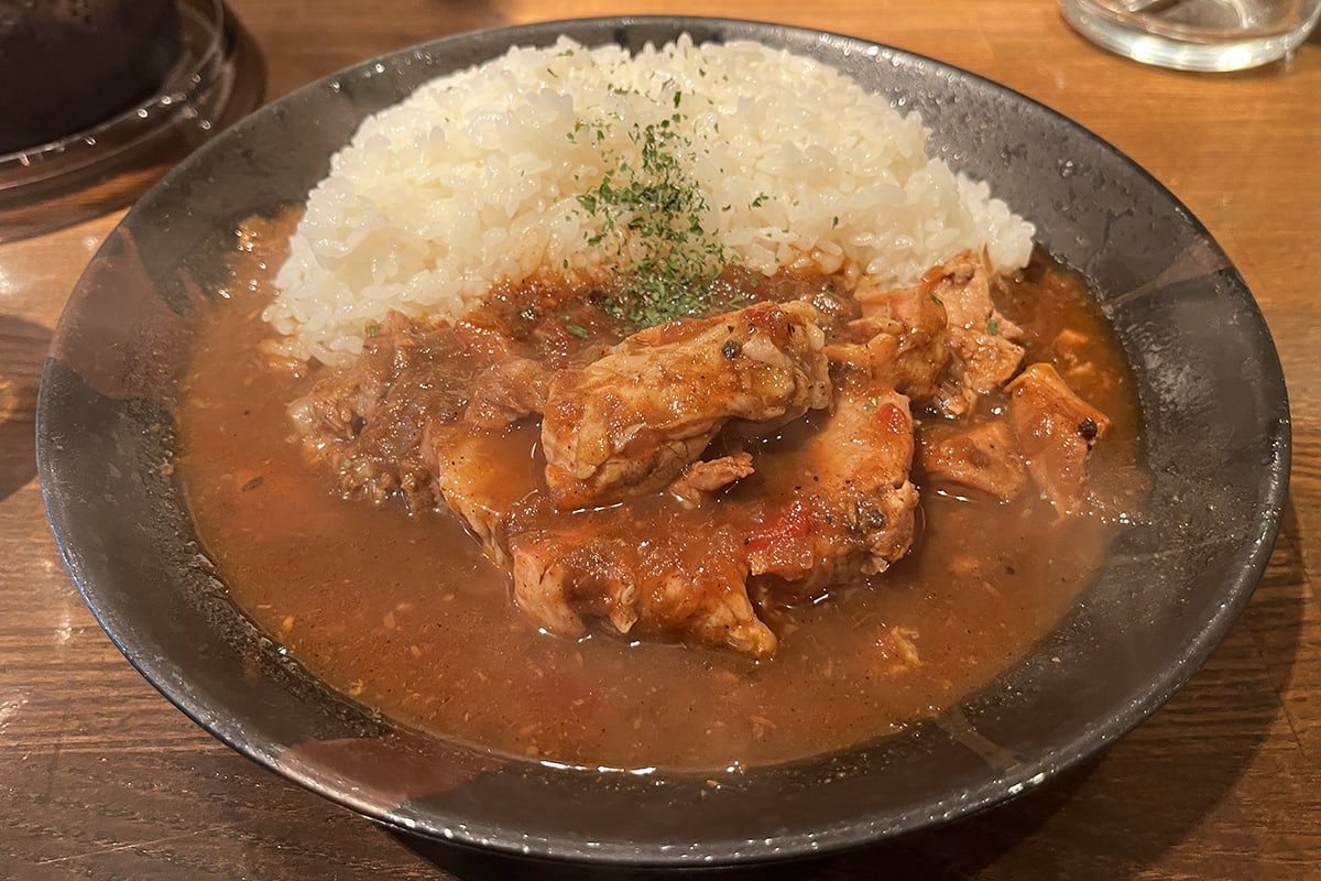 名物のキーマカレーも素晴らしいが、辛味とスパイス感がキリッと冴えわたるポークカレーも絶品。スパイシーなスペアリブがまるっと一本豪快に入っているワイルドなカレーだ。