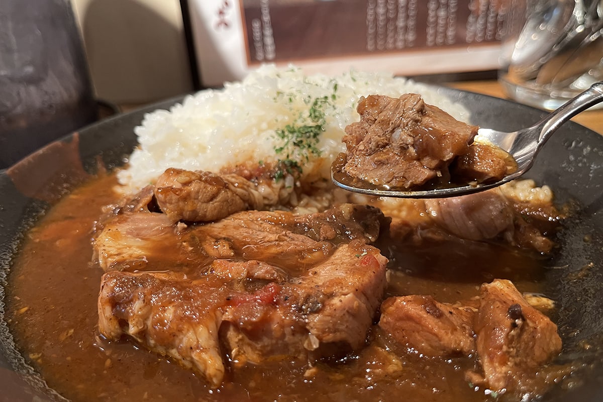 刺激が欲しいときはこちらのポークカレーをぜひおすすめしたい。スプーンでホロッとくずれるほど、柔らかく煮込まれたスペアリブが口の中でとろける。骨からスルッとほぐれるコラーゲンも美味。