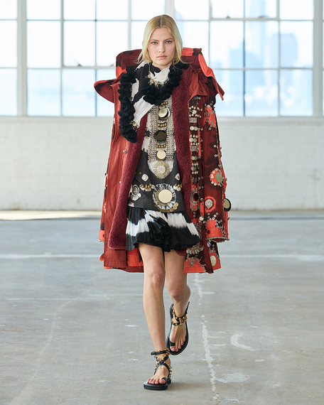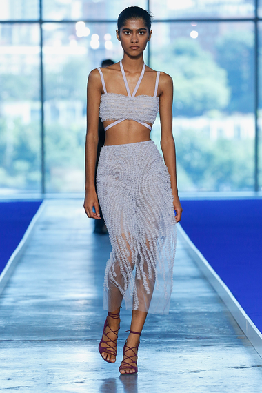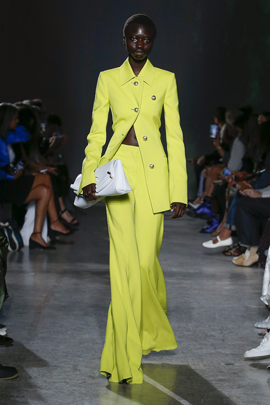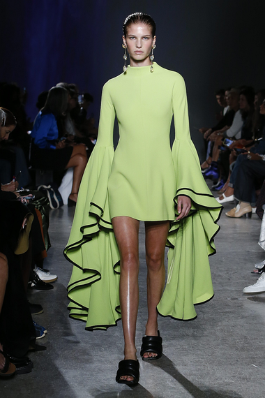 プロエンザ?スクーラーは、ショー会場の壁と柱に流れ落ちる滝の映像を流しながらショーを行った。コレクションも、流れるような動きがいっぱい。フリンジと、おおげさなくらいのボリュームをもたせた裾広がりのシルエットがその代表だ。デザイナーのラザロ?ヘルナンデスのラテンのルーツと、ジャック?マッコローのアメリカ的実用性をミックスしたという。フリンジはブラトップに垂らしたり、肘から二重に垂らしたり。ビーズのフリンジもあるし、ミニフリンジをつけたアップリケを散らしたものもある。パンツは膝から裾にかけて、ダイナミックに広げる。ドレスは絞ったウエストから裾に向けて、たっぷりのフレア。肘から入れたフレアは、前は短く後ろは足首に届くくらい長くして、ドラマチックな動きを生み出す。素材は大きめの穴をあけたハンドクロシェ、レース、ニットが多い。ウエストをややシェイプしたコートは、伸縮性のあるテリーツイードで仕立てた。