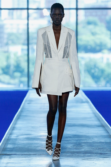 ジェイソン?ウーのつくる服は、やっぱり官能的で美しい。ボディーに沿ったテーラーリングでシルエットを作りこみながら、リラックスした表情をもたせる。肩パッドを入れたテーラードジャケットは、オーガンディを部分的にはめ込み、細いひもをひらひら垂らす。袖下は肘から切り離され、腕に自由な動きを許す。チュールのミニフリルを走らせたチュールのブラトップに合わせたひもディテールは、日本の「縛り」に着想した。今回協業したイタリアのコンテンポラリーアーティスト、レオナルド?プッチは、「縛り」をもろさと強さが隣り合わせになっているテクニックと捉えている。セットアップしたスカートにチュールのフリルで描いた模様も、繊細で美しい。