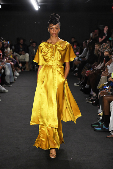 パブリックスクールの創業デザイナーの一人、マックスウェル?オズボーンが始めたブランド、アンオンリーチャイルドの初のショーは激混み。マスク着用率は1%程度。パブリックスクールが脚光を浴びていた頃の、熱狂をほうふつとさせた。服は都会のナイトライフ向け。ドレッシーなサテンとベロアを多用し、ドレープ、ギャザー、ピンタック、ティアードなどクラシックなディテールを散りばめながら、カッティングと量感でアバンギャルド感を出す。メンズは、よりリラックスしたセットアップを見せた。