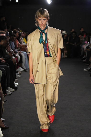 アルトゥザッラは自然と旅への憧れを砂漠にリンクし、日焼けしたようなカラーパレットとリラックスしたフォルム、民族調のディテールで表現した。オープニングは、崩しを入れたメンズトラッド。シャツはレースアップのひもをだらんと垂らし、胸元をのぞかせる。パーカもVネックセーターもルーミー。パンツはワイドレッグで、裾をずるずる引きずる。最初から最後までたびたび登場するタッセル付きのスカーフが、フォークロア気分を加える。後半はコイン飾り、絞り染め、ジオメトリックにアレンジしたアニマルプリントが並ぶ。ボディーにしなやかにまとわりつく、ニットのドレスとセットアップも着やすそう。最後はシルバーのコイン、ビーズ、ディスクをびっしり飾ったパーカを見せた。